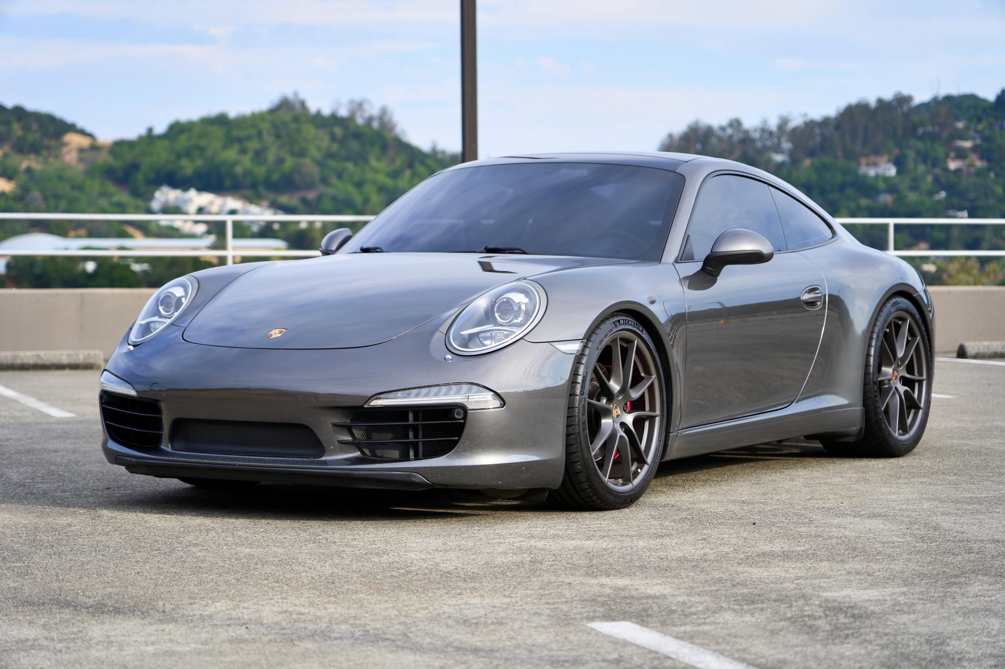 The 20″ Carrera S alloy wheels feature Elephant Racing spacers and are mounted with 245/35 front and 305/30 rear Michelin Pilot Sport 4s tires showing 2021 and 2022 date codes. Braking is handled by red-painted Porsche-branded calipers over cross-drilled and ventilated discs, and the car is equipped with Porsche Active Suspension Management (PASM) in addition to Eibach lowering springs. Replacement rear brake pads and rotors were fitted in March 2021. The replaced springs are included in the sale.