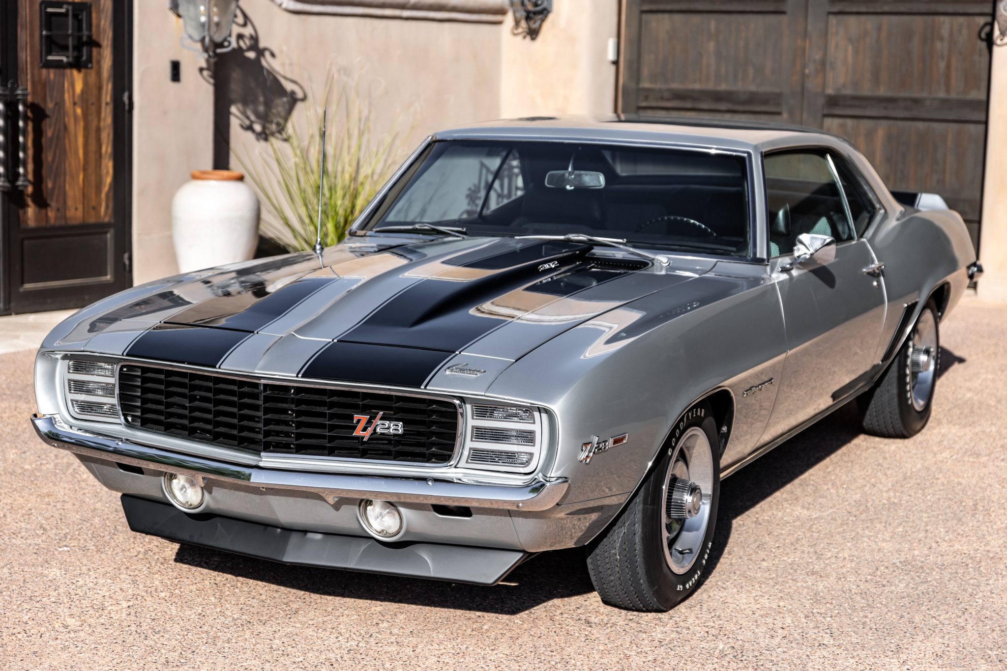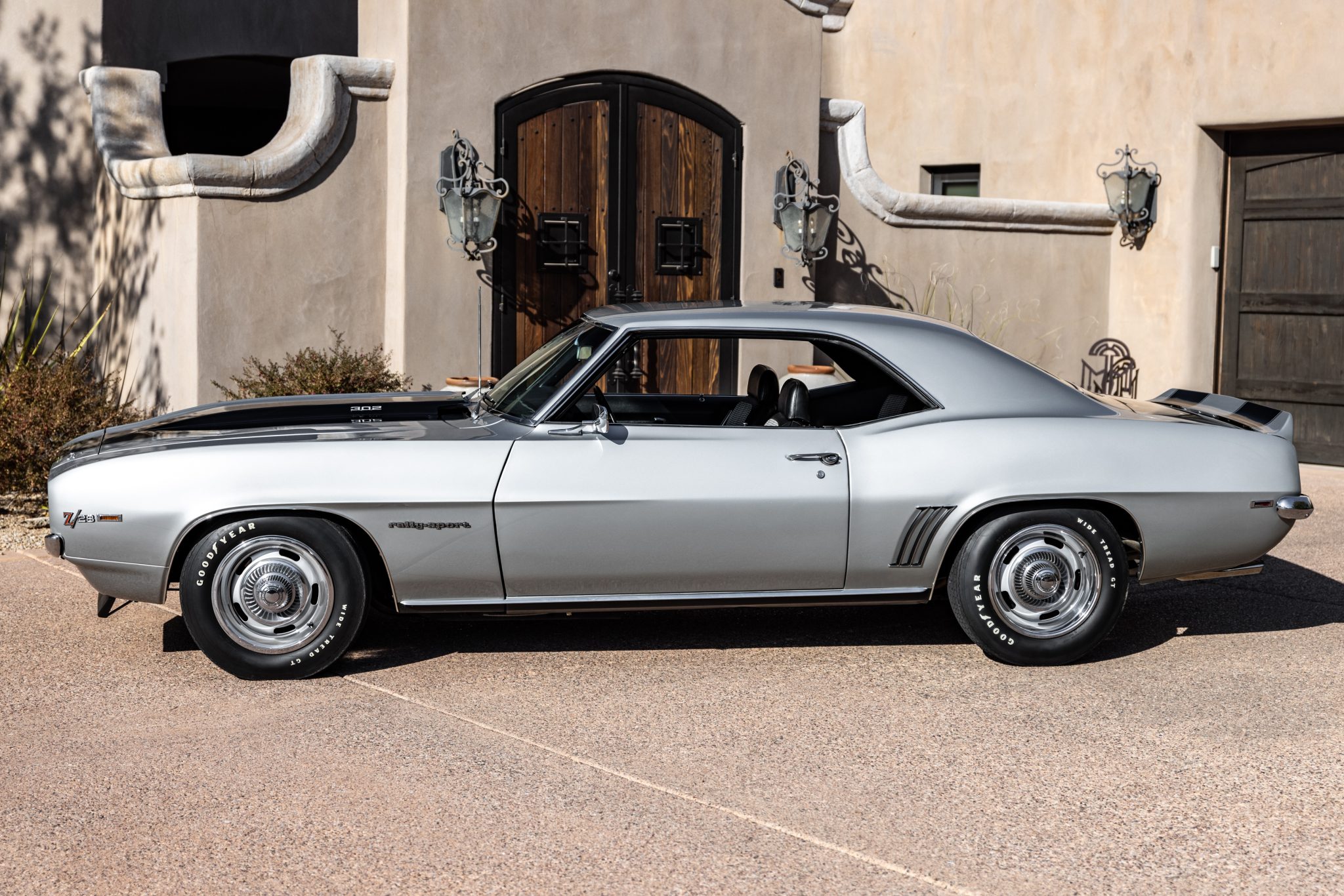 Silver-painted 15″ Rally wheels wear polished trim rings and hubcaps and are mounted with Goodyear Wide Tread GT bias-ply tires. A matching spare wheel and tire are mounted in the trunk along with a jack. Power-assisted steering was equipped from the factory, and braking is handled by power-assisted front discs and rear drums.