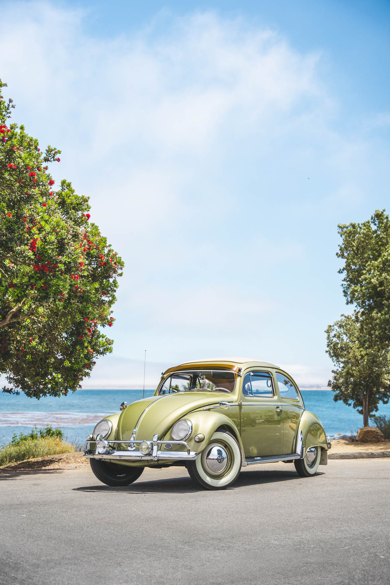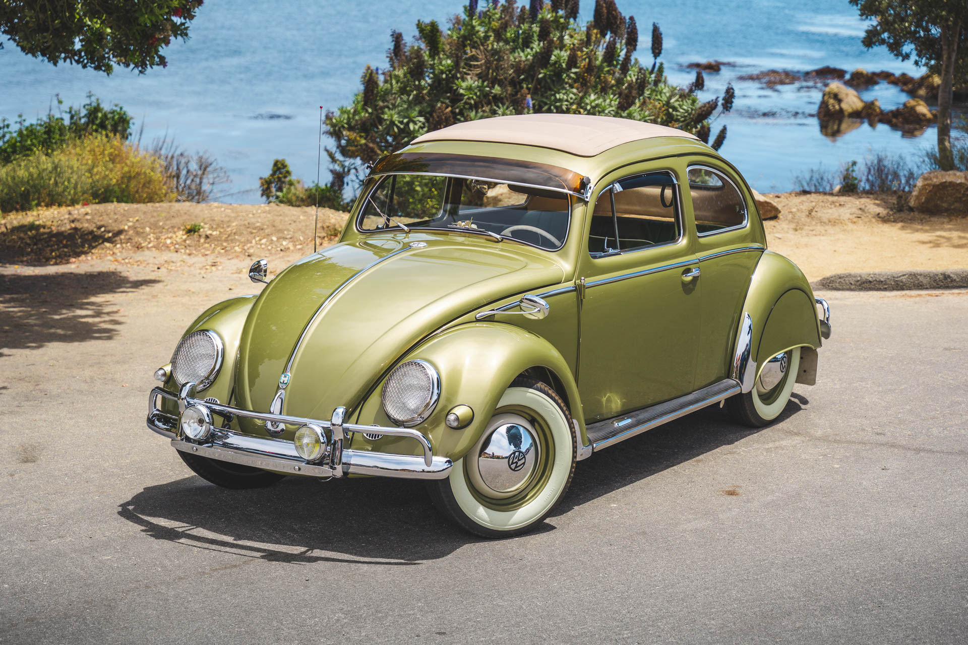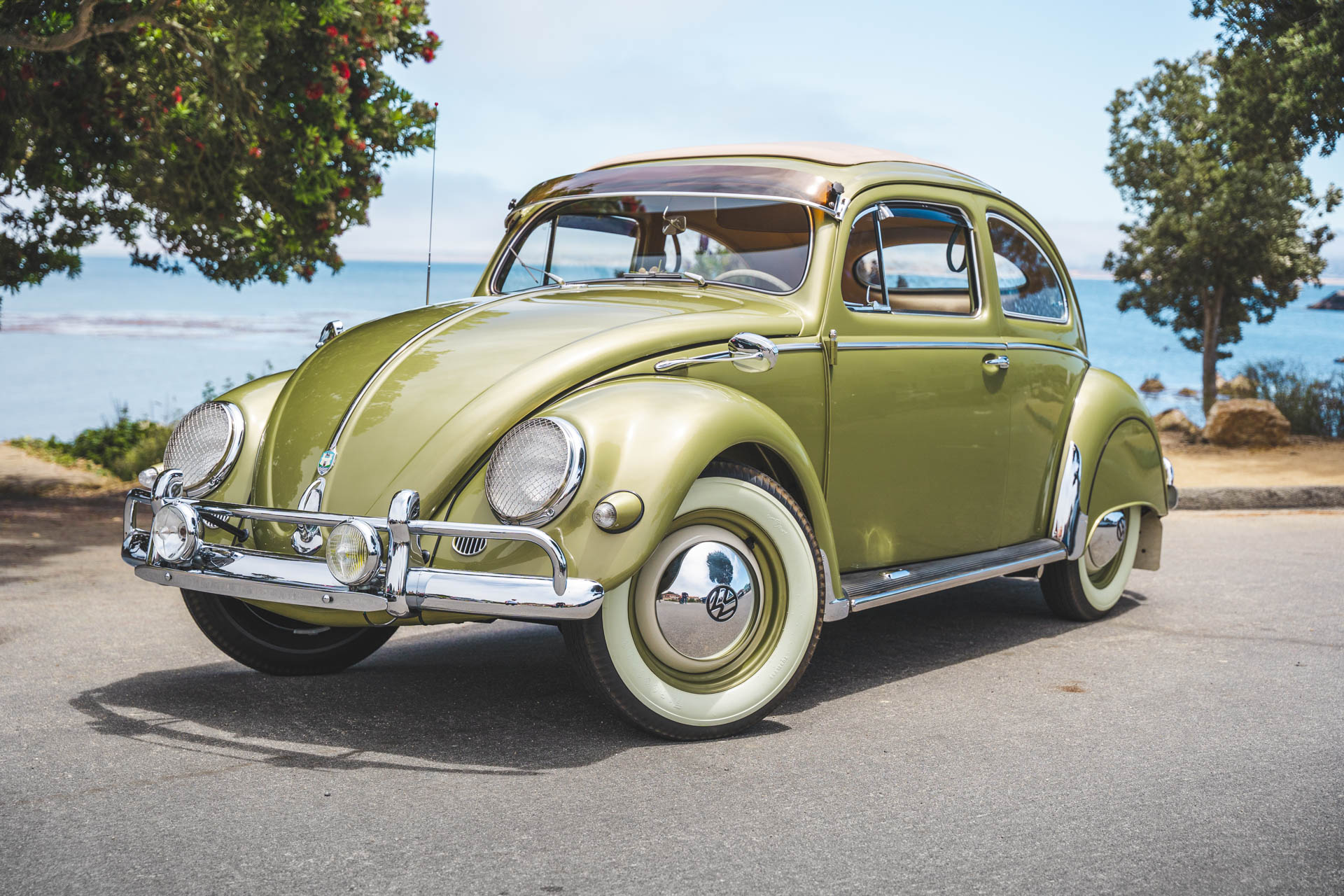 Body-color 15″ steel wheels wear chrome VW-branded hubcaps and are wrapped with Firestone whitewall tires, while a matching spare is mounted in the front trunk. Braking is handled by four-wheel drums.