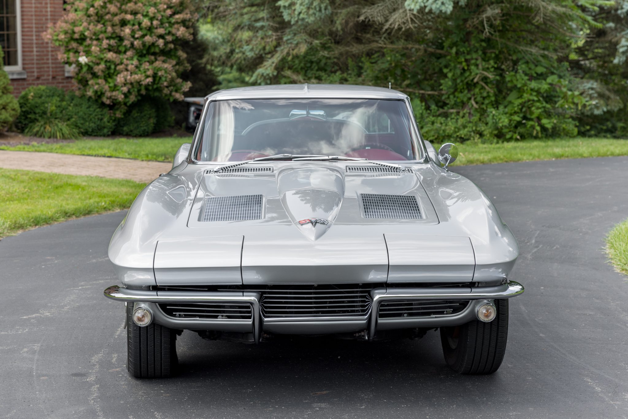 The 15″ turbine-style wheels wear three-eared knock-off spinners and are mounted with redline tires. The C2 was the first Corvette to offer fully independent suspension, with upper and lower control arms at the front and a three-link setup with a transverse leaf spring at the rear. The car is equipped with power steering, and braking is handled by four-wheel power-assisted drums.