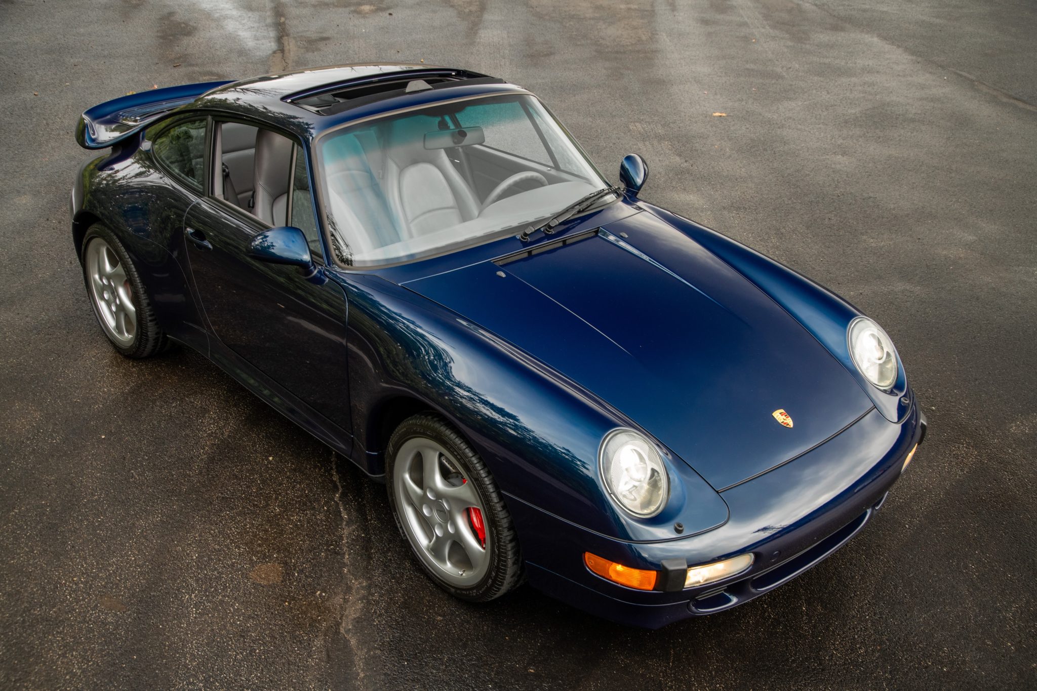 The 18″ Turbo Twist wheels are mounted with Pirelli P Zero Rosso tires measuring 225/40 up front and 285/30 out back. The car features an Automatic Brake Differential (ABD), and the 993 was the first 911 to feature multi-link rear suspension. Braking is provided by red Porsche-branded four-piston calipers over cross-drilled rotors.