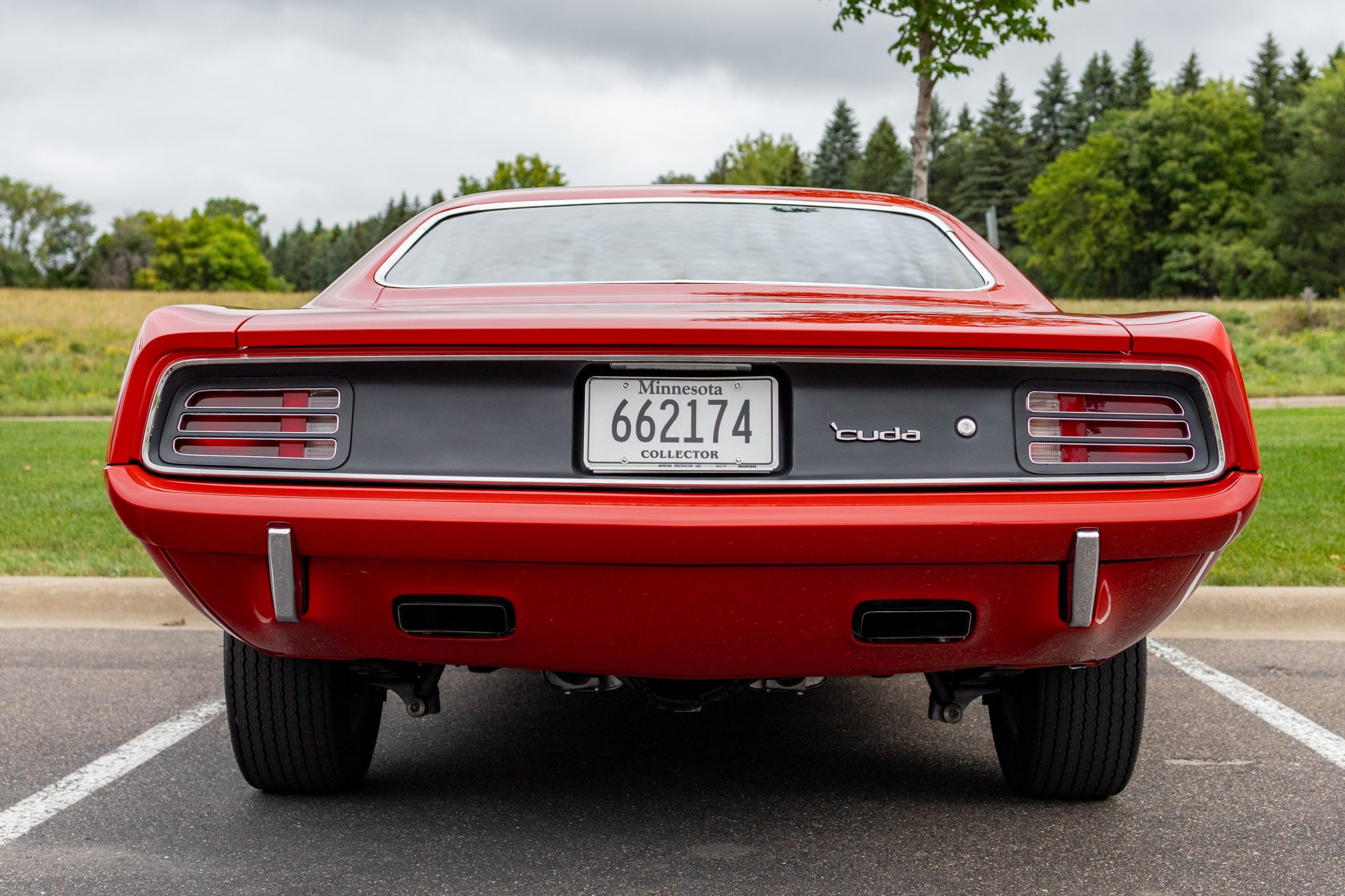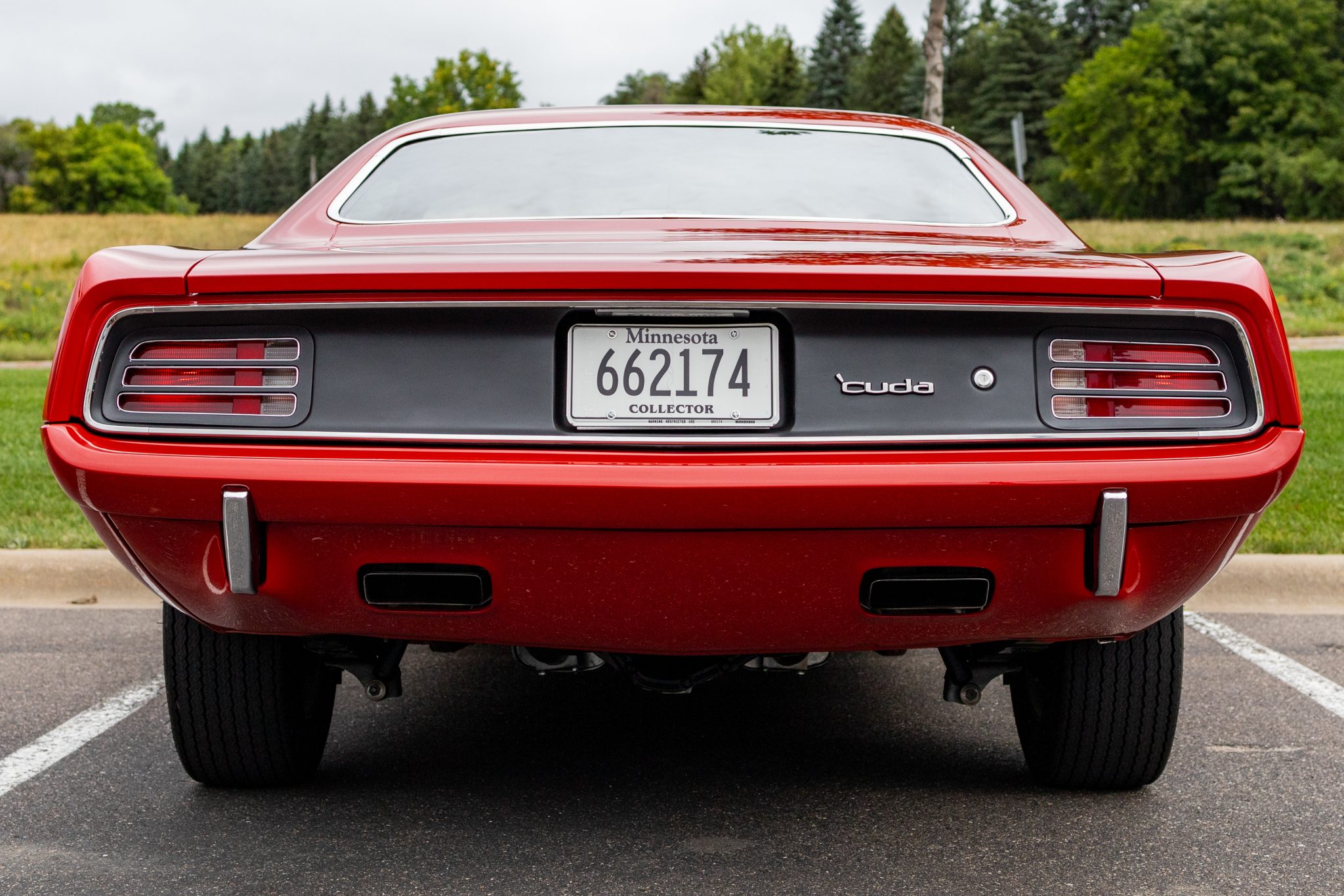The Rallye wheels wear trim rings and are mounted with Goodyear Polyglas GT F60-15 white-letter tires. A steel spare wheel with a Goodyear space-saver tire is stowed in the trunk. E74 Hemi cars received special suspension, a front sway bar, and firm-ride shock absorbers. Stopping power is provided by power-assisted front discs and rear drums.
