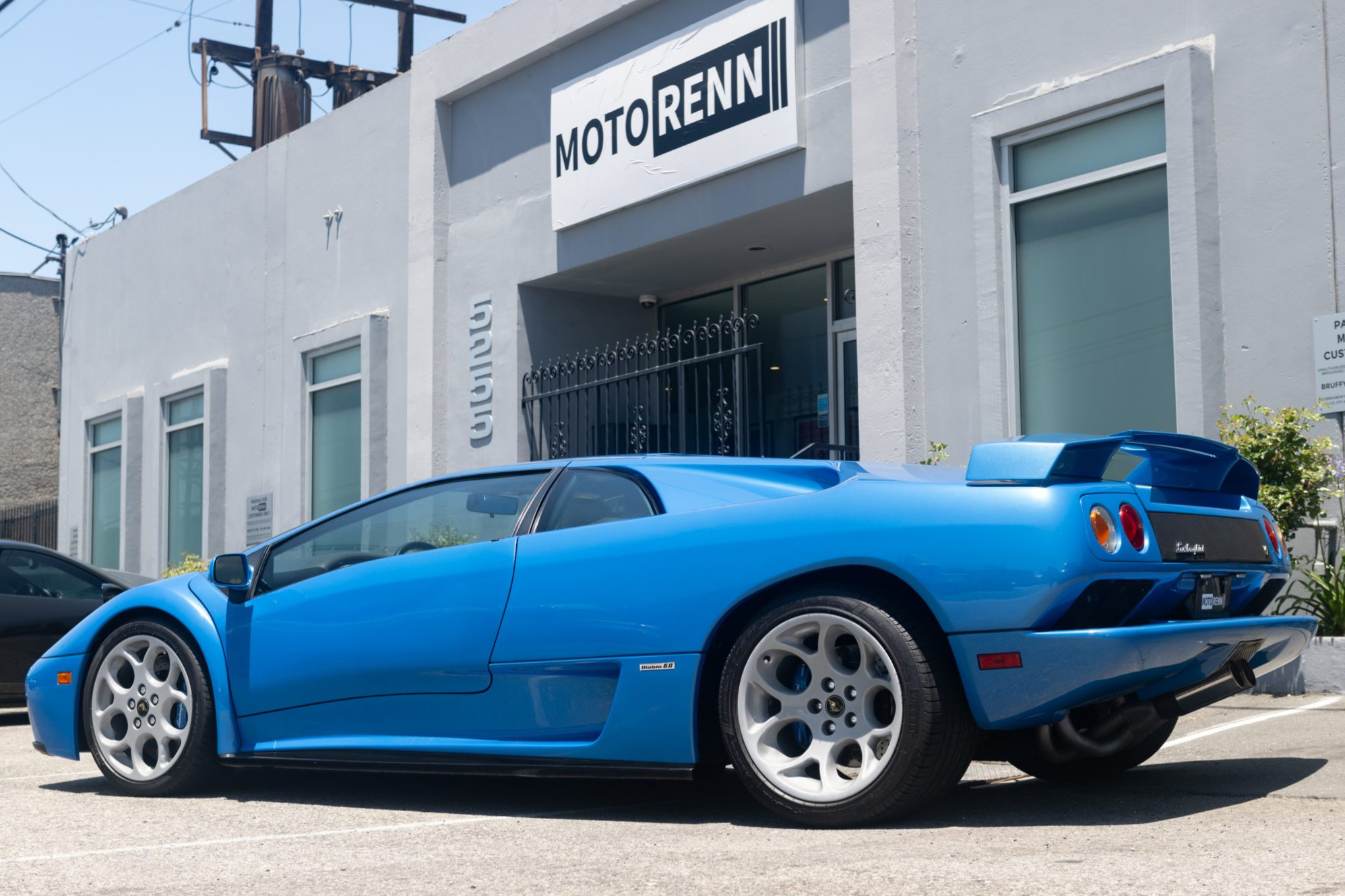 The 18″ Speedline alloy wheels are mounted with 245/35 front and 335/30 rear Pirelli P Zero tires. The car was optioned with an adjustable suspension, and stopping power is provided by an anti-lock system with blue multi-piston Brembo calipers over cross-drilled rotors. The front shocks were rebuilt in 2019.