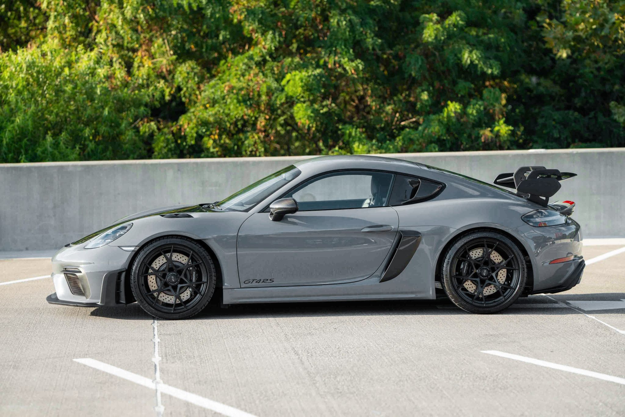 Center-locking 20″ forged aluminum wheels are finished in Satin Black and are wrapped in 245/35 front and 295/30 rear Michelin Pilot Sport Cup 2 tires. Braking is handled by black-finished multi-piston calipers mounted over composite cast-iron and aluminum rotors, and this example was optioned with a front-axle lift system.