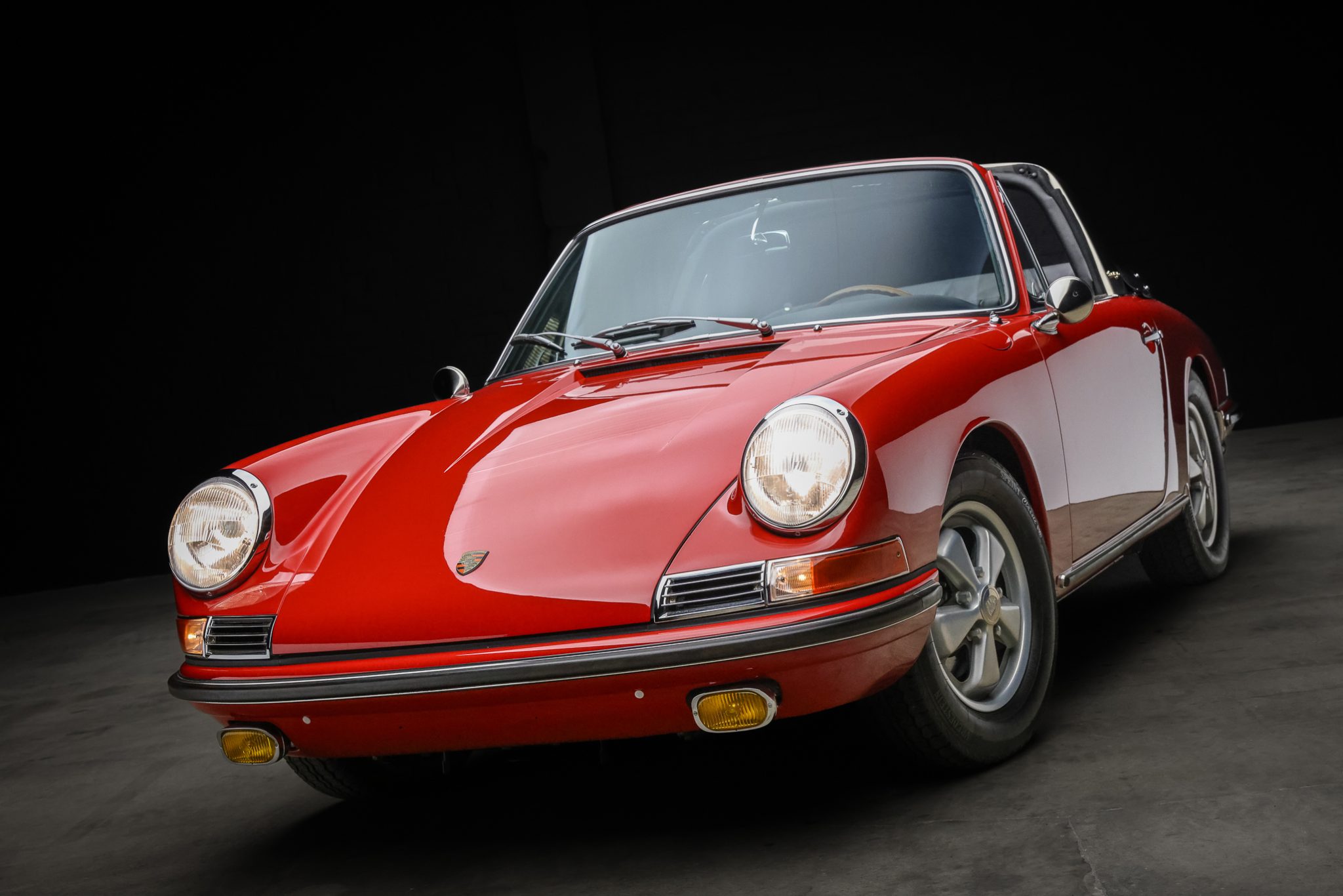 The 15″ Fuchs alloy wheels measure 4.5″ in width and are mounted with 165-series Vredestein Sprint Classic tires, while a matching spare is located in the front trunk. Stopping power is provided by four-wheel ventilated disc brakes.