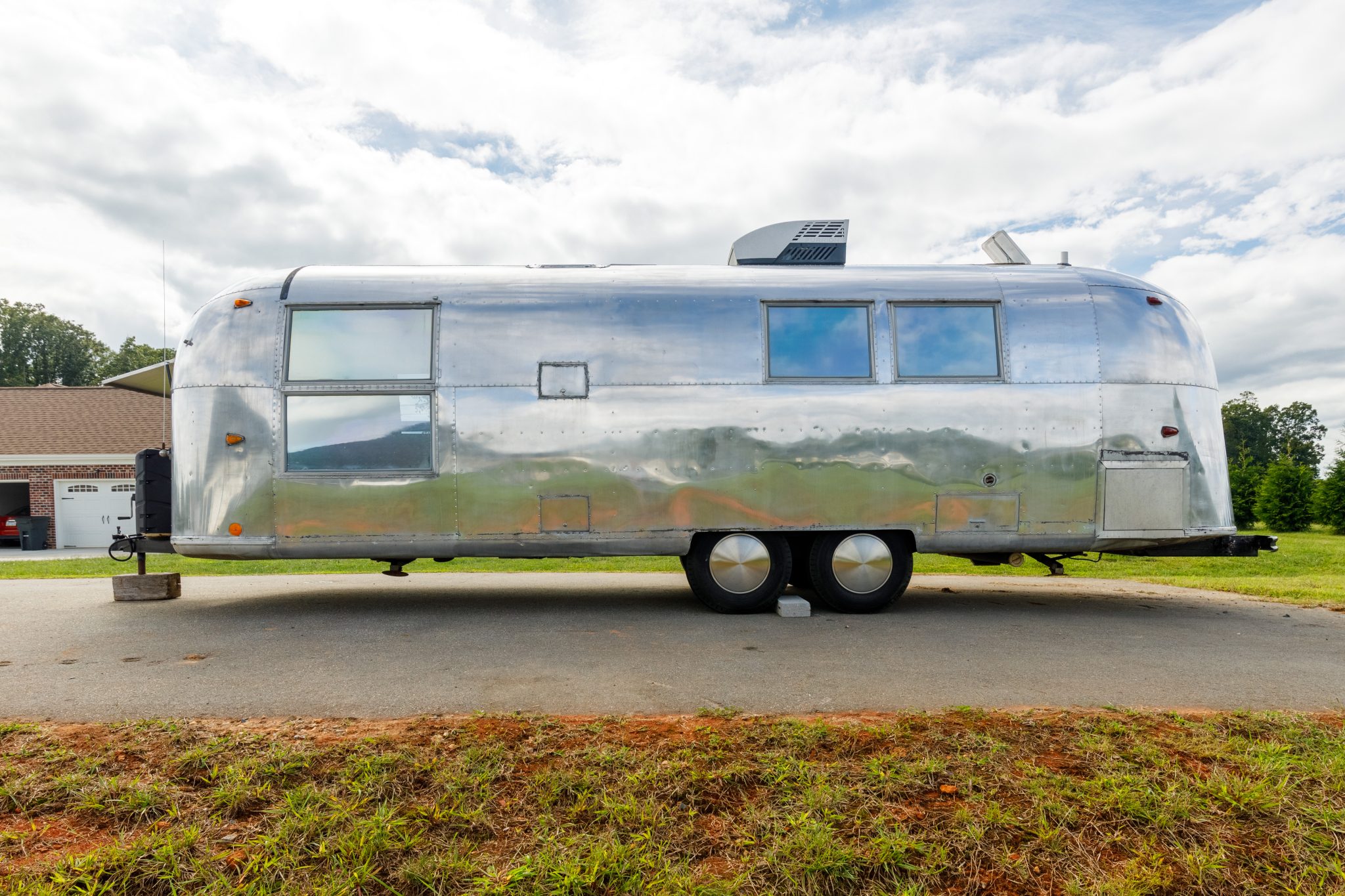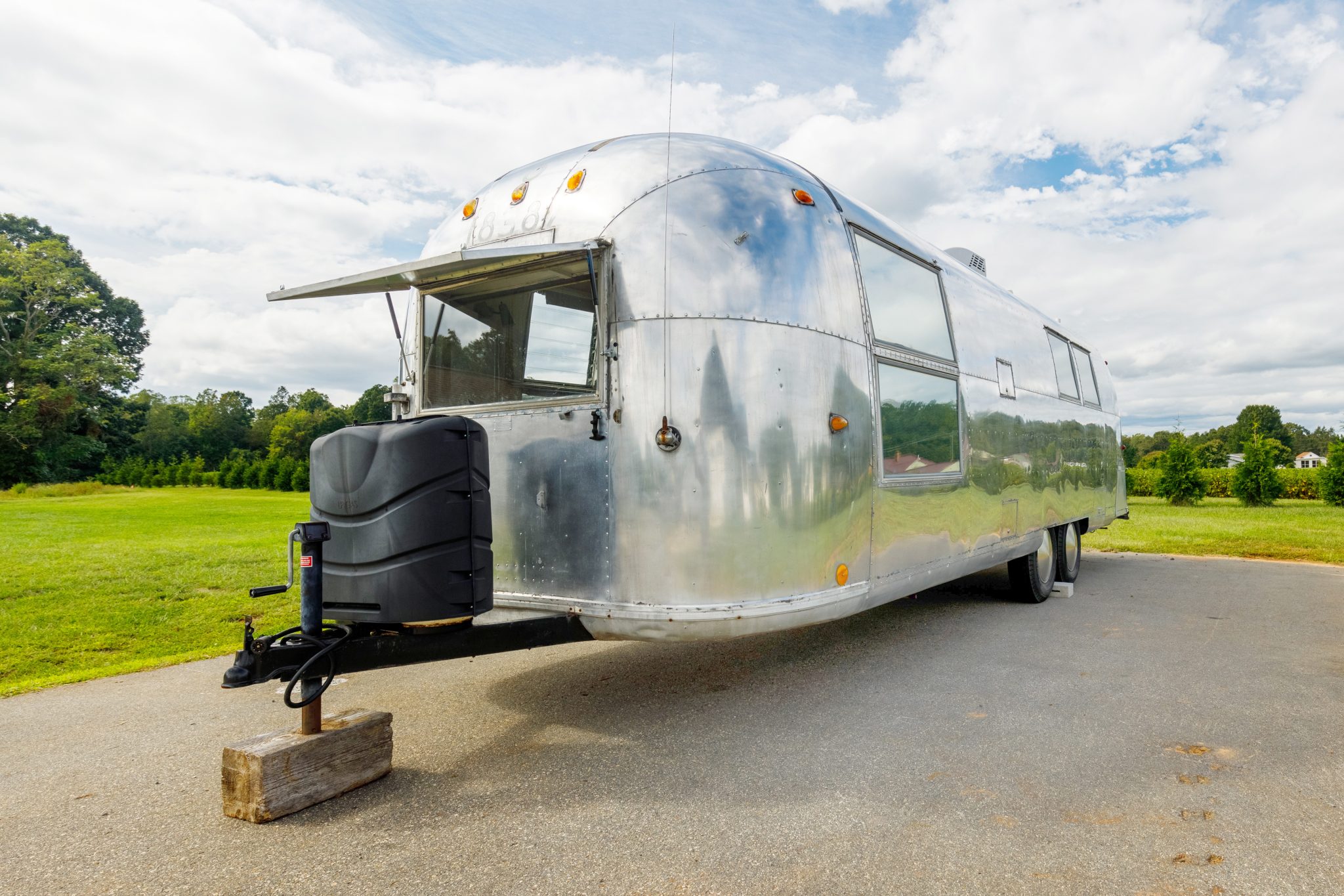 The double-axle chassis rolls on steel wheels wearing polished covers and 7.00-15 Roadguider QH-505 tires. Stopping power is provided by electrically actuated drum brakes, and the chassis is equipped with a manual tongue jack. Infrastructure equipment includes a freshwater tank, a waste tank, a tongue-mounted propane tank, and shore connections for water, waste disposal, and electrical service.