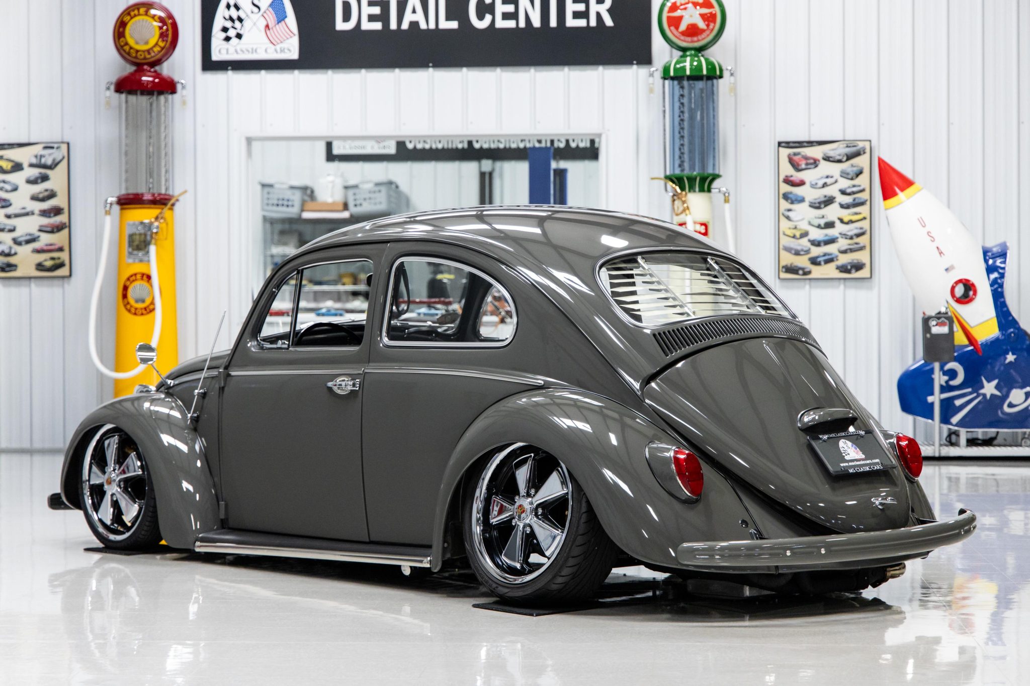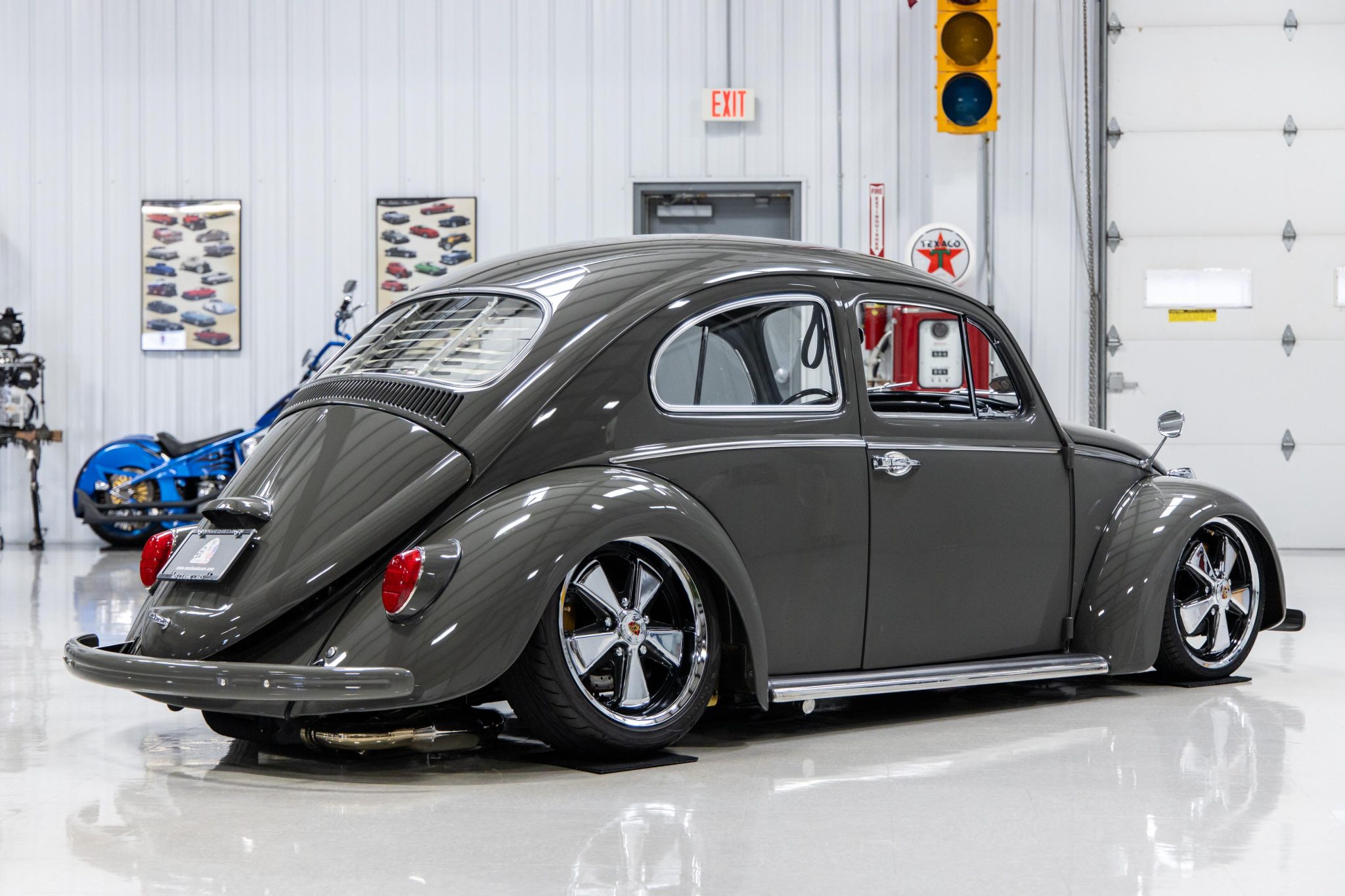 Staggered-width 17″ Fuchs-style wheels feature Porsche-branded center caps and are mounted with 165/40 Accelera tires up front and 215/40 Yokohama S. Drive tires out back, while a matching spare wheel is stored in the front trunk compartment. A 3P Air Lift Performance air suspension management system has been installed, and Monroe air shocks are fitted at each corner. The front suspension is said to consist of an Airkewld 4” adjustable front beam and 2” dropped spindles, while the rear suspension is reportedly equipped with a Limebug cantilever air ride system and custom spring plates as well as Coolrydes custom spring plate retainers. Stopping power is provided by four-wheel drilled disc brakes with Wilwood four-piston calipers up front.