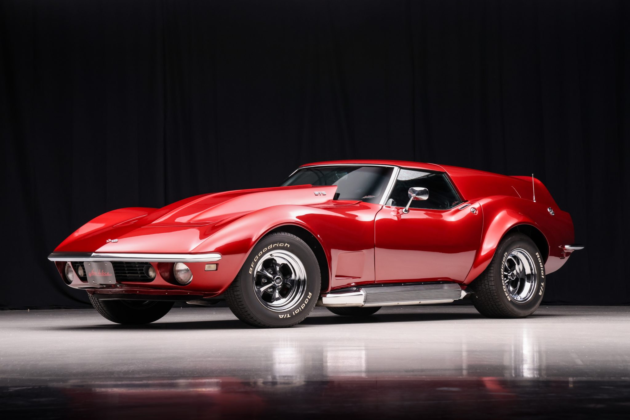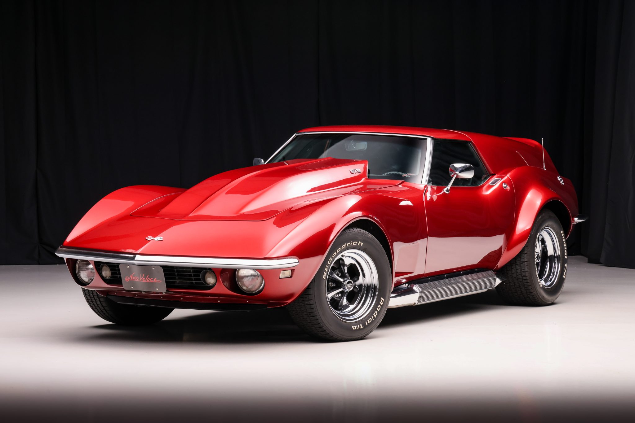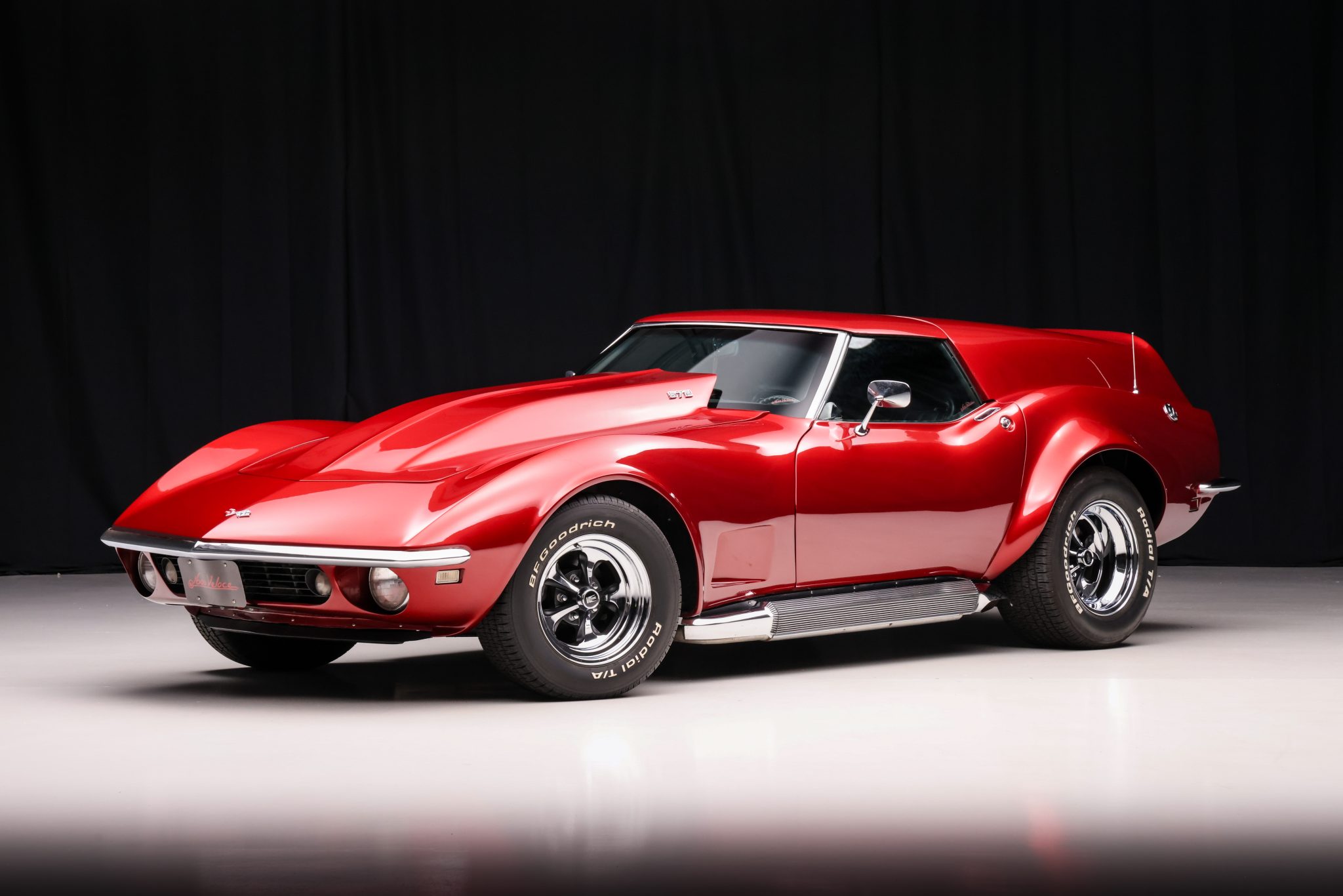 Series 32 Keystone 15″ wheels are finished in chrome with black accents and wrapped in BFGoodrich Radial T/A white-letter tires measuring 245/60 up front and 295/50 at the rear. Braking is provided by unassisted four-wheel discs.