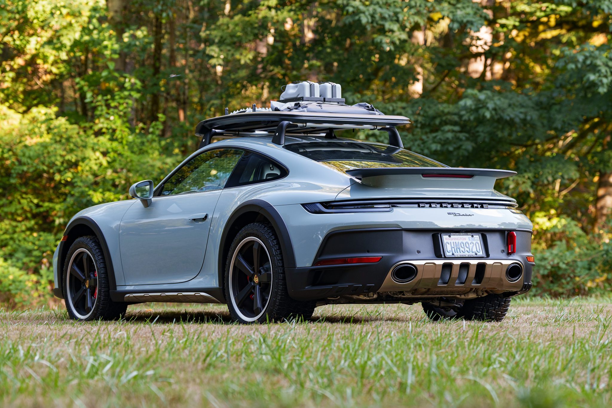This example is finished in optional Shade Green Metallic, and clear paint protection film has been applied to the front end by the original selling dealer in August 2023. Equipment includes stainless-steel front and rear skid plates, a carbon-fiber front hood with stainless-steel vents, a carbon-fiber fixed rear spoiler, body-color mirror bases, 911 Dakar puddle lamps, black rocker-panel cladding with inset stainless-steel guard plates, black wheel-arch extensions, lightweight glass, red front and rear tow hooks, and Exclusive Design tailpipes finished in silver. A Porsche Dakar roof rack featuring an inset light bar, a spade, jerry cans, and sand recovery rails was installed by Porsche Bellevue in August 2023.