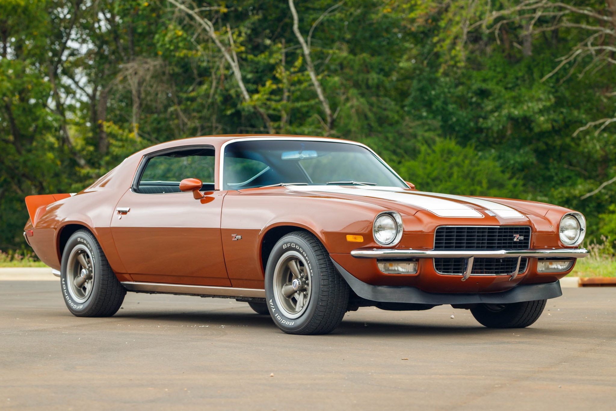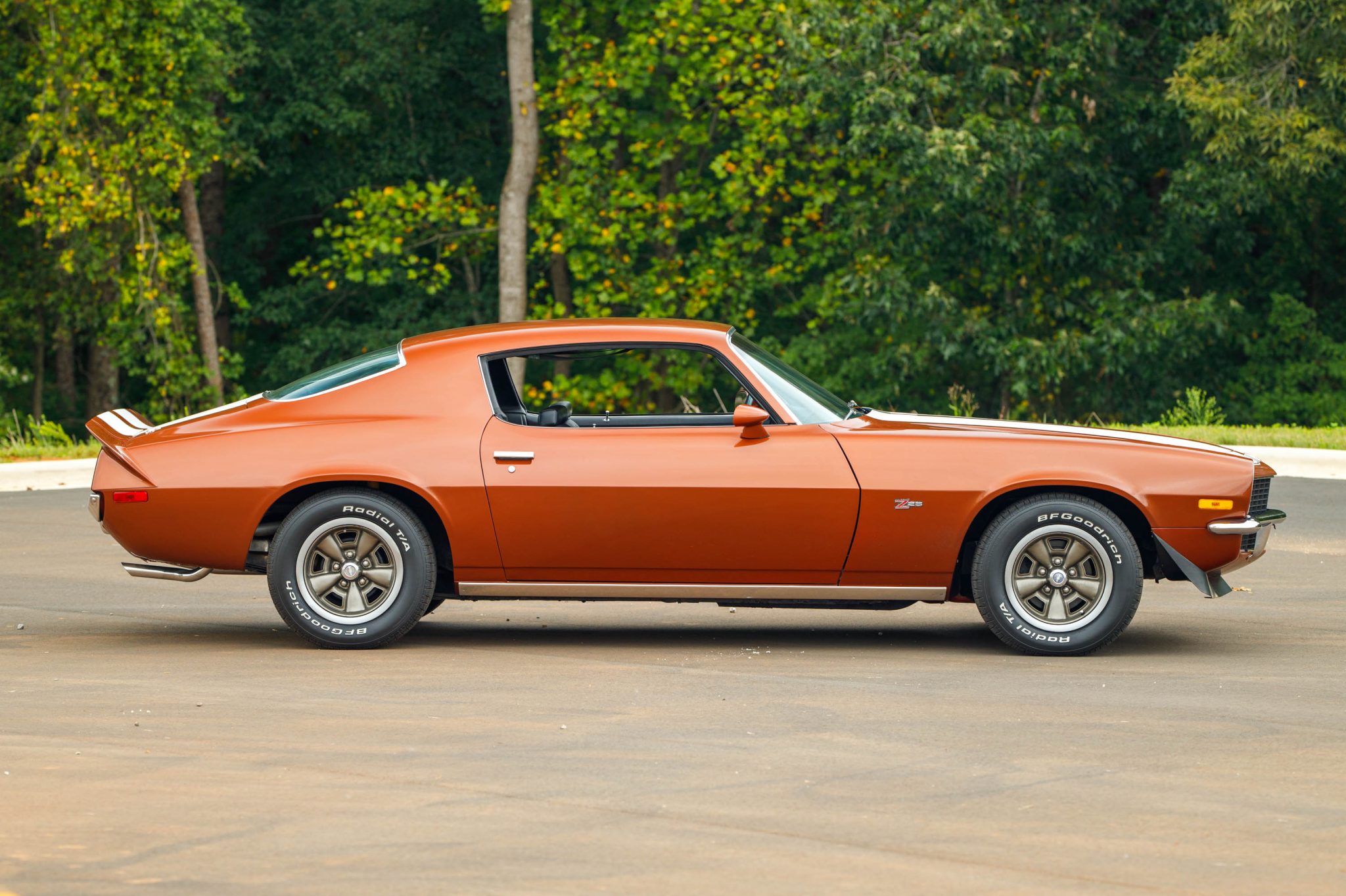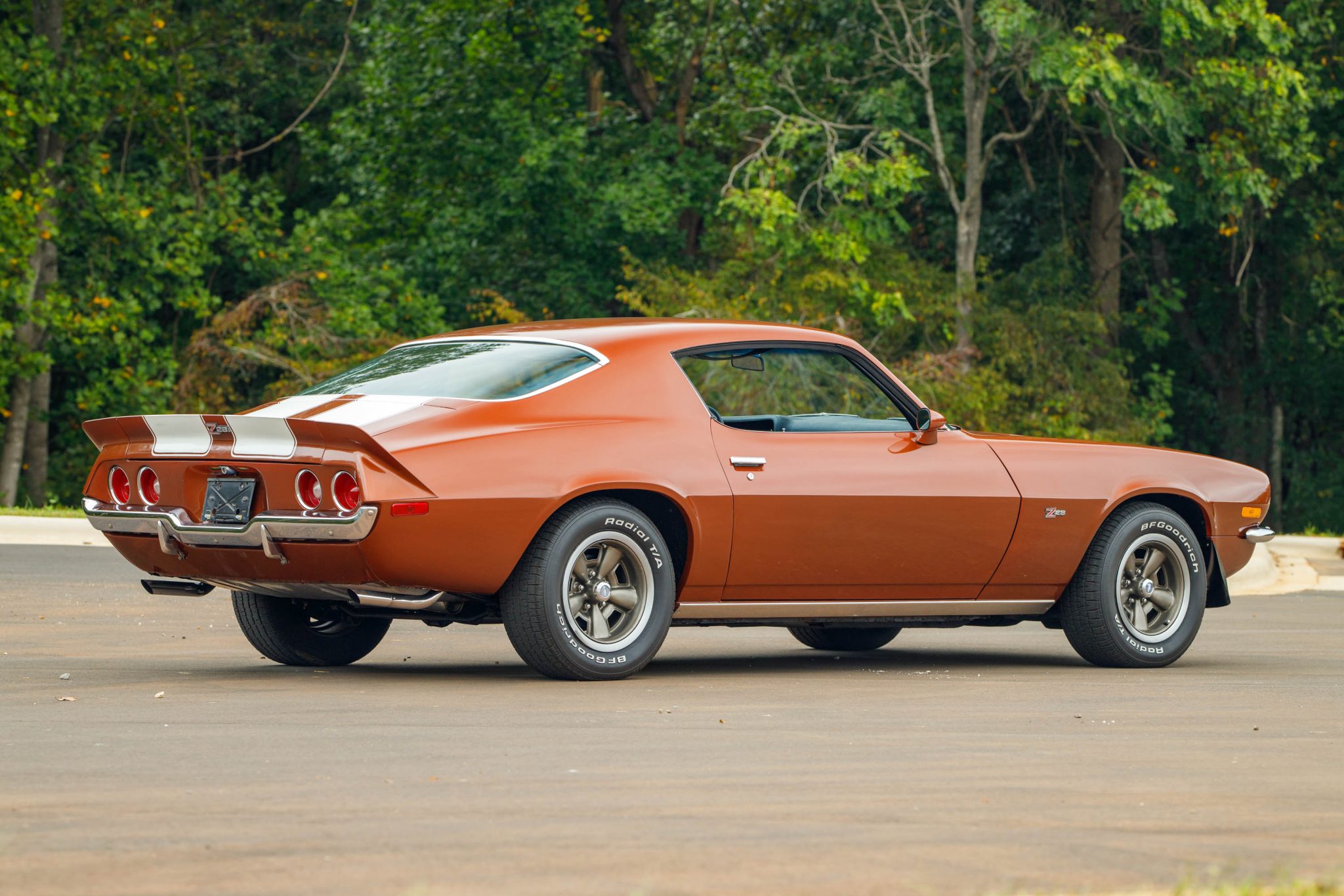 The 15″ five-spoke wheels are mounted with 235/60 BFGoodrich Radial T/A tires. The car is equipped with power steering, and the Z28 package included higher-rate springs and shocks, front and rear stabilizer bars, and a quick-ratio steering box. Braking is provided by power-assisted front discs and rear drums.