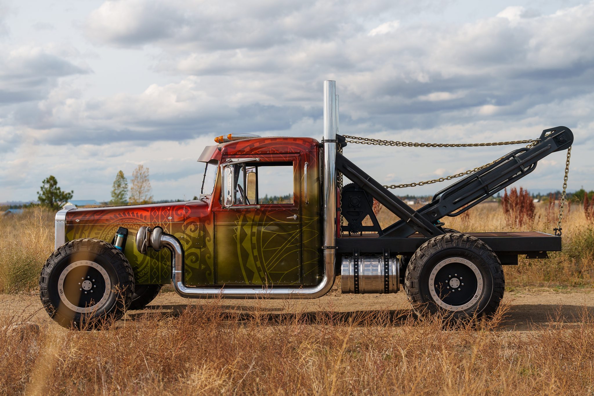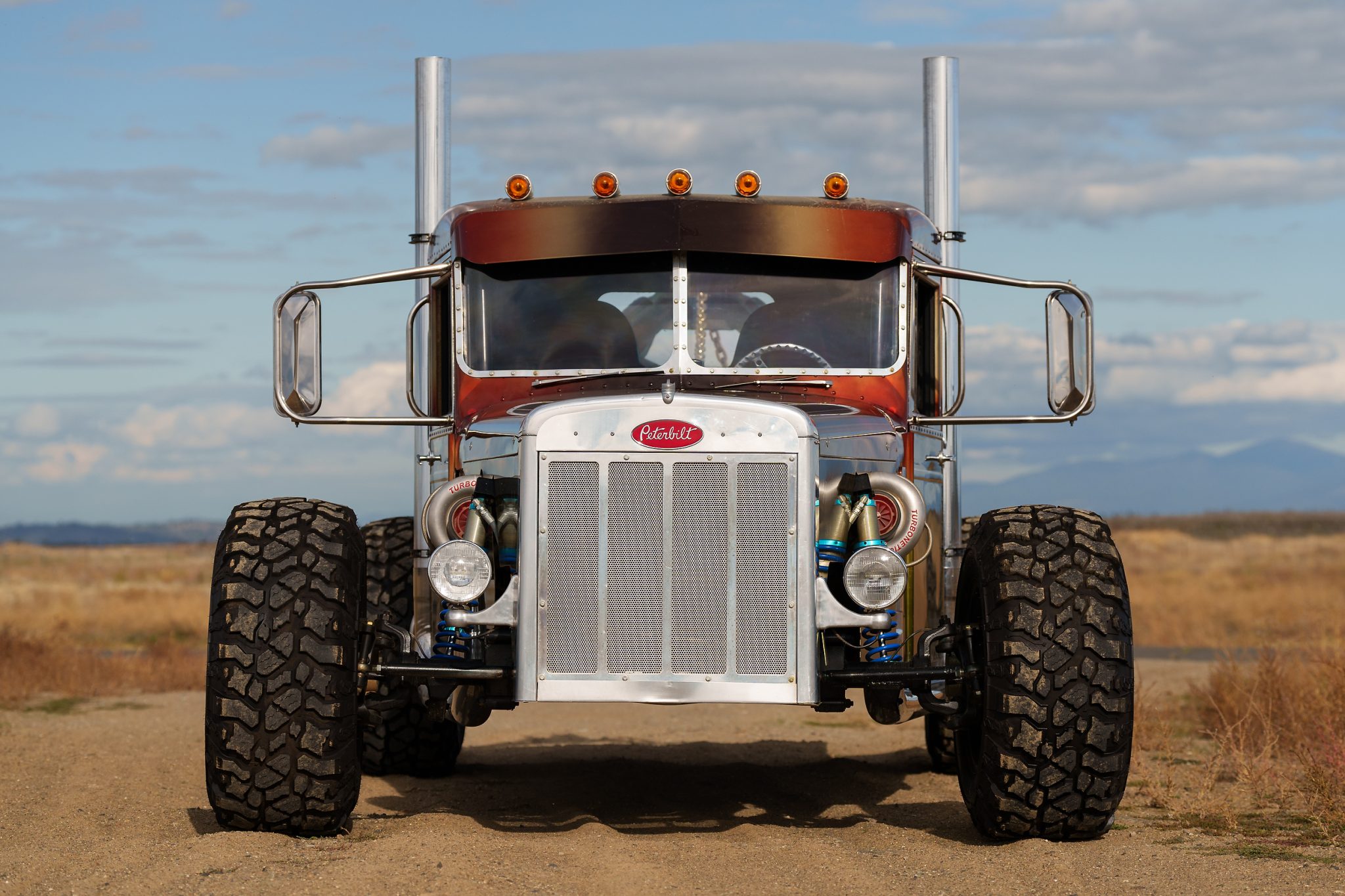 Eight-lug 20” wheels are finished in black with simulated beadlocks and are mounted with 39.5×16.50″ Pit Bull Rocker tires. Stopping power is from power-assisted disc brakes. The truck is said to ride on the modified chassis from a 1983 Chevrolet Suburban and is equipped with a Lee power steering gearbox, a multi-link suspension system, and King adjustable remote-reservoir coilover shock absorbers.