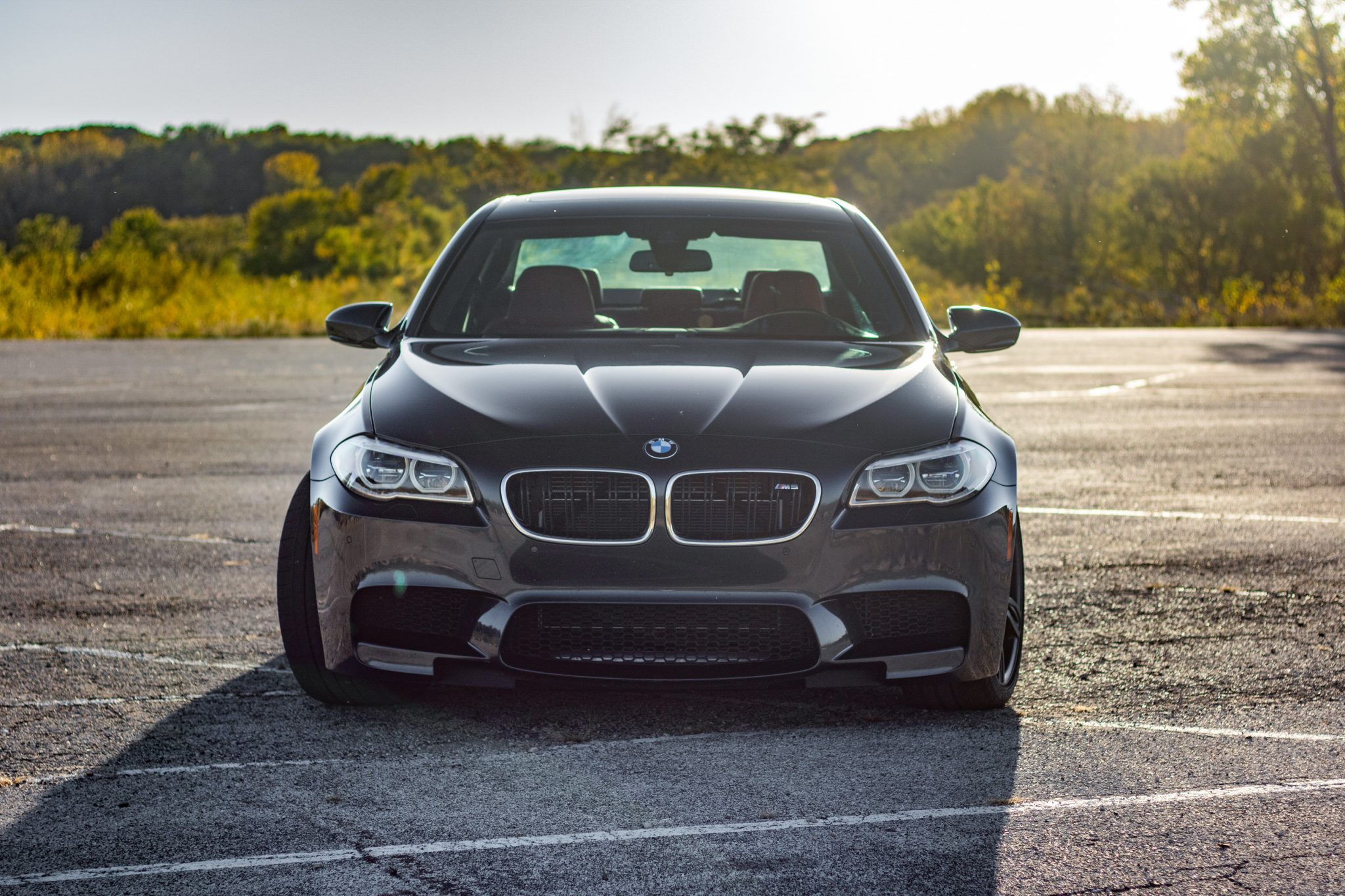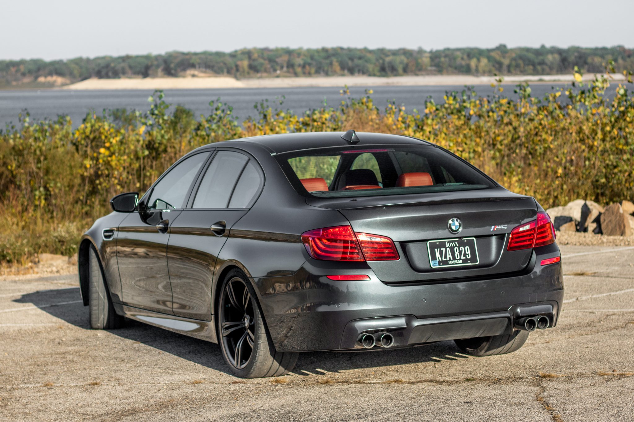 Black-finished 20″ Style 343M alloy wheels are mounted with staggered-width Michelin Pilot Super Sport tires. The Competition Package added thicker sway bars, stiffer springs and dampers, a lower ride height, and a recalibrated stability control system. Stopping power is provided by M-branded calipers over cross-drilled and ventilated rotors. Curb damage is located on the right-front wheel.