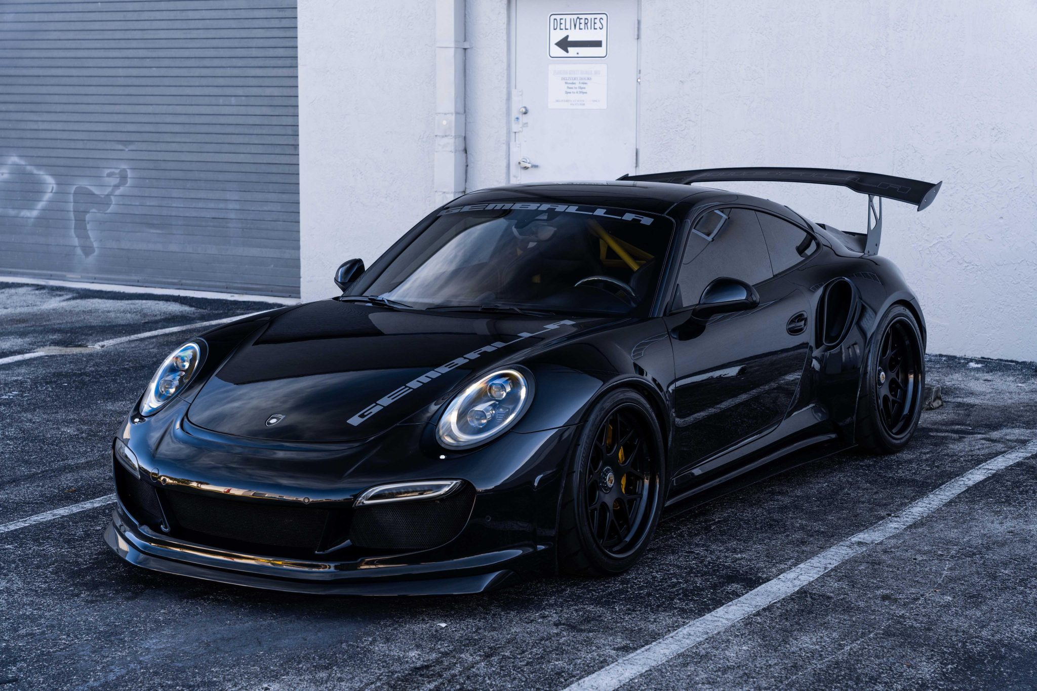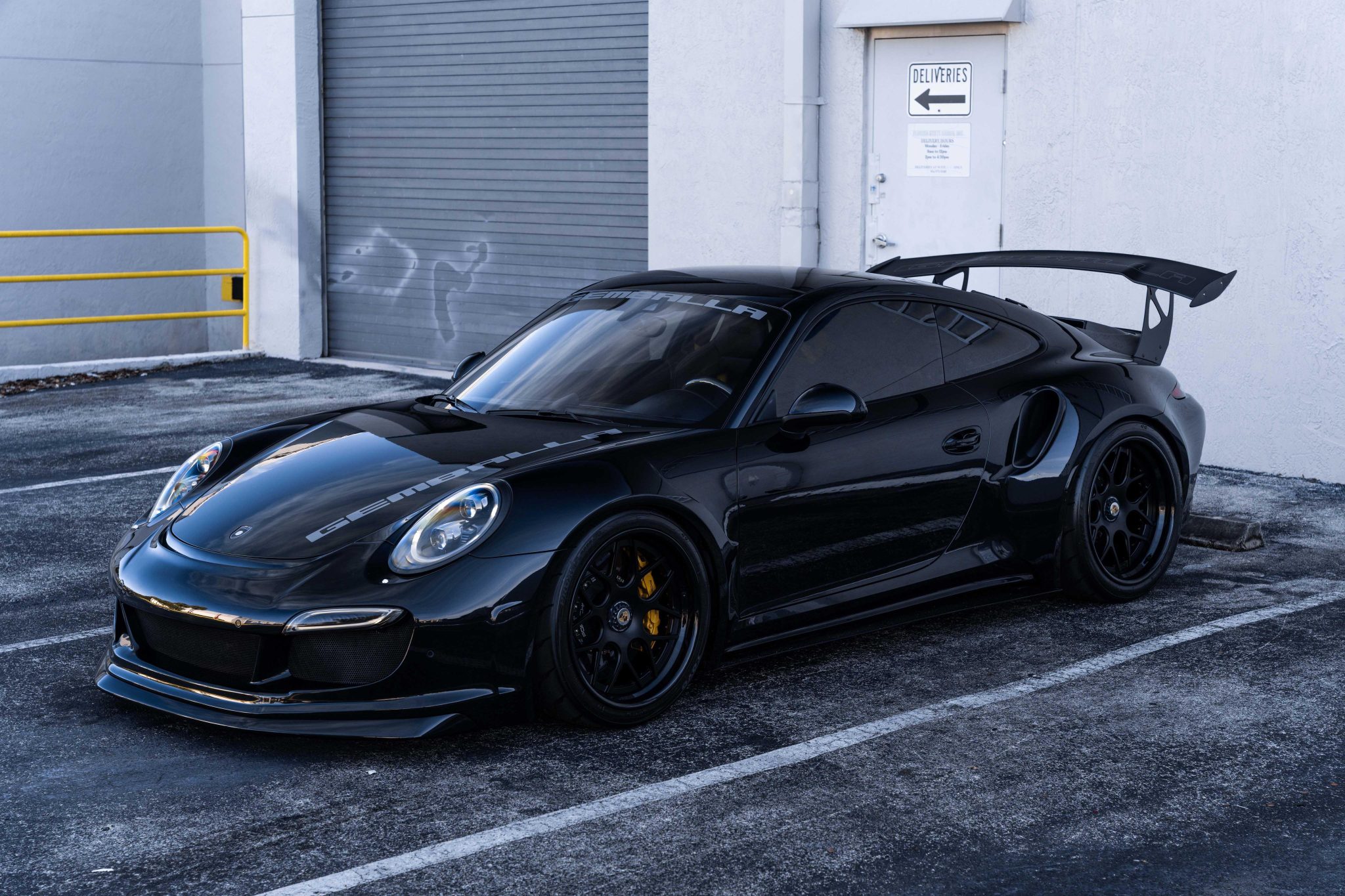Black-finished 20″ HRE multi-piece center-lock wheels are mounted with 255/35 front and 325/30 rear Toyo Proxes R888R tires showing 2019 and 2020 date codes. Braking is handled by Porsche Ceramic Composite Brakes (PCCB) featuring yellow-painted Porsche-branded calipers at all four corners. Rear-axle steering was standard equipment on the Turbo S, and a TechArt front-axle lift system and springs have been fitted under current ownership.