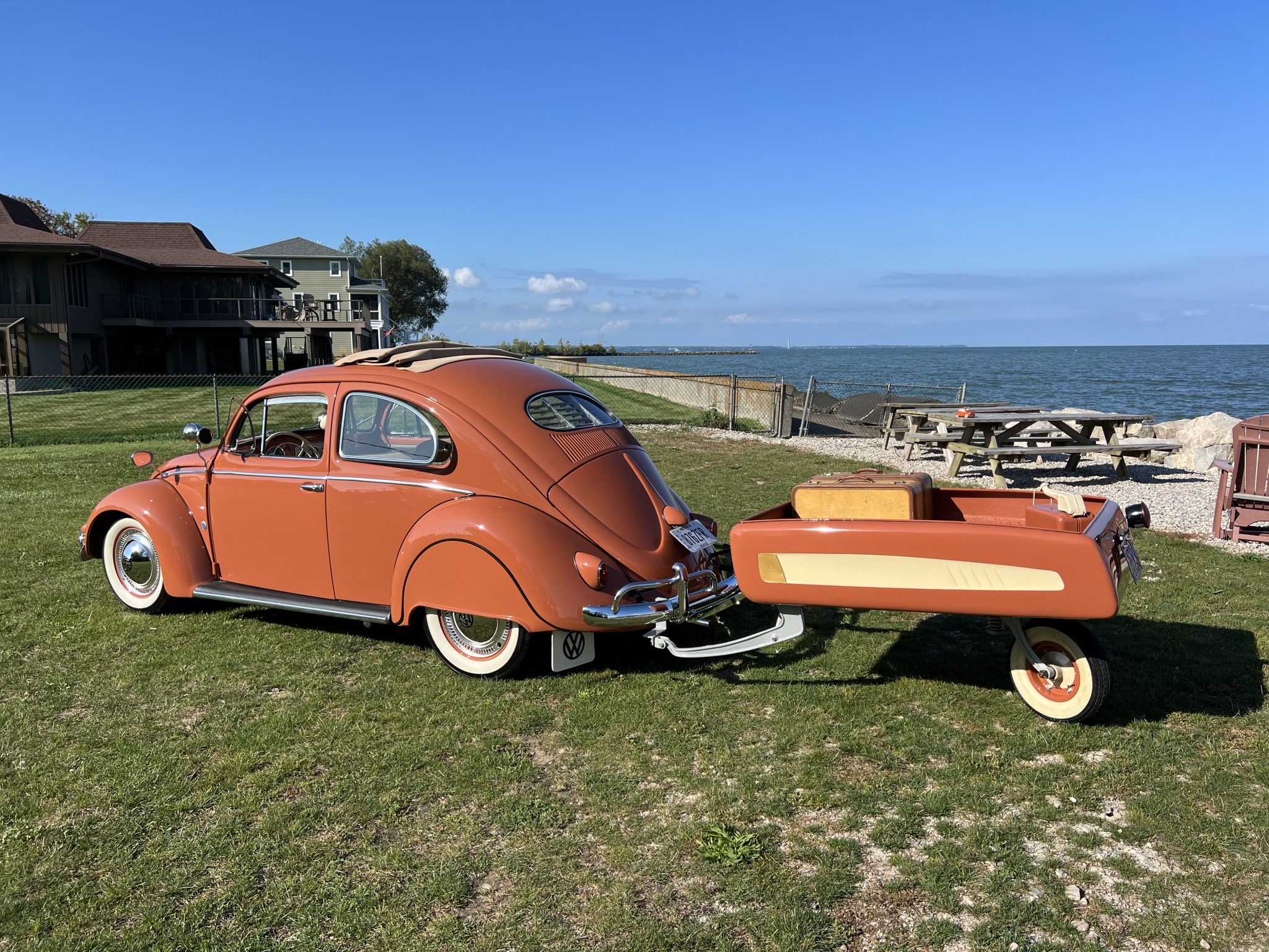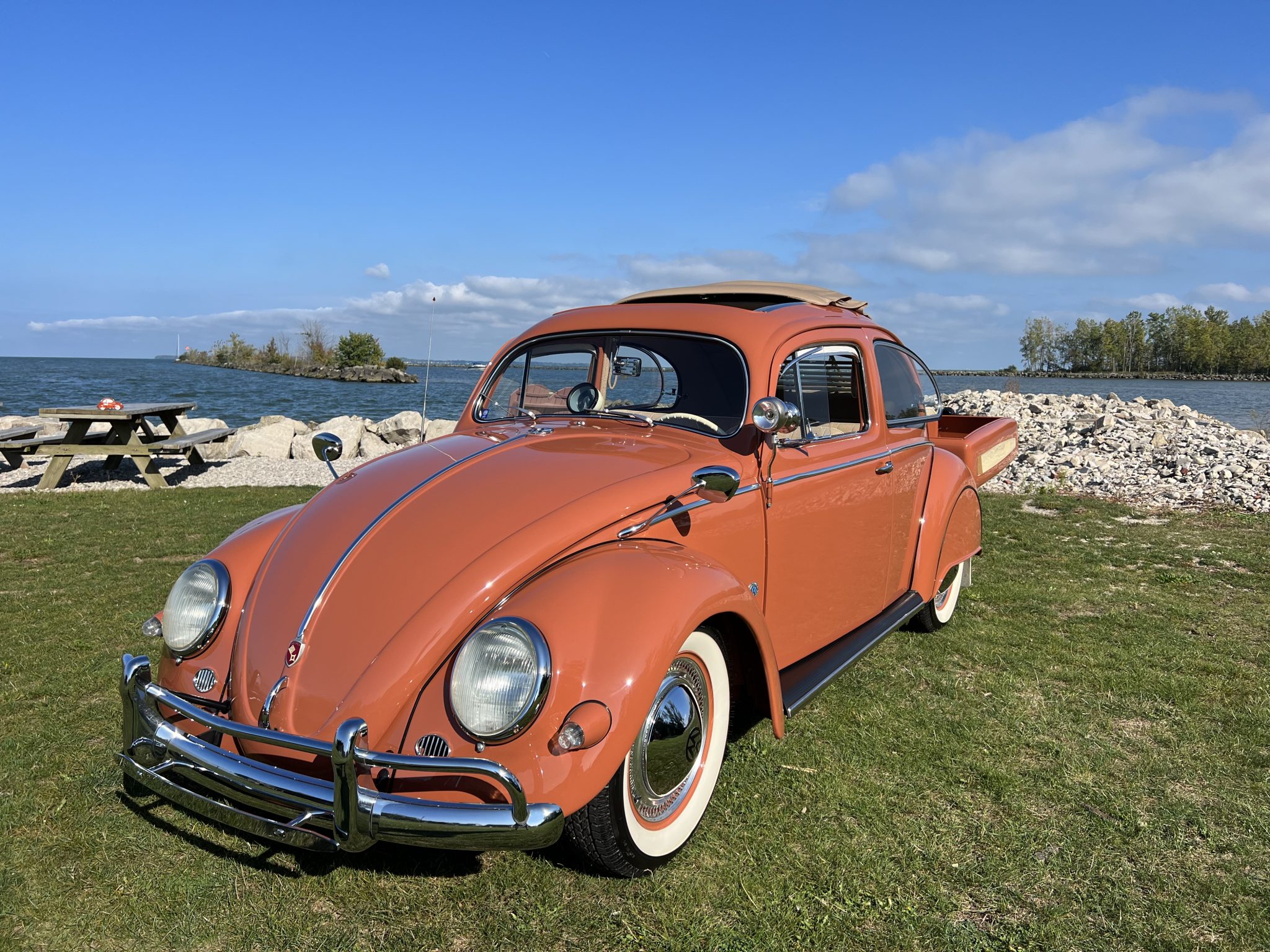 Body-color 15” steel wheels wear VW-branded chrome hubcaps and decorative trim rings. Coker Classic whitewall tires are mounted at all four corners. The suspension has been lowered, and front disc brakes have been added.