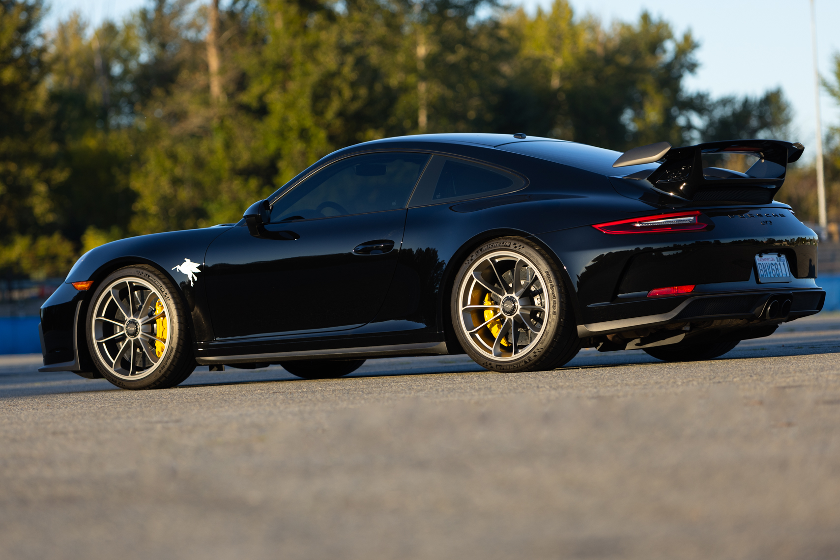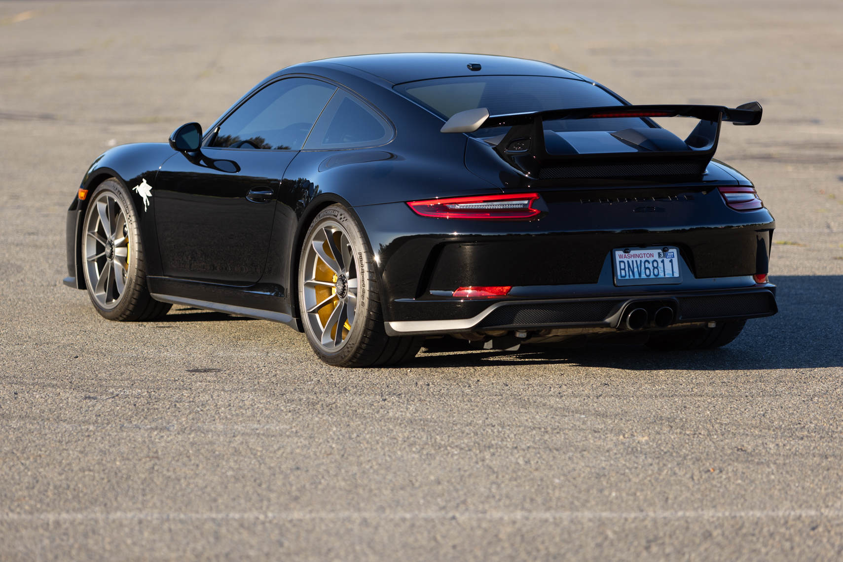 The 20″ center-lock alloy wheels are mounted with 245/35 front and 305/30 rear Michelin Pilot Sport Cup 2 tires. Braking is handled by yellow Porsche-branded calipers over ceramic-composite rotors. The car is equipped with a front-axle lift system, rear-axle steering, and Porsche Active Suspension Management.