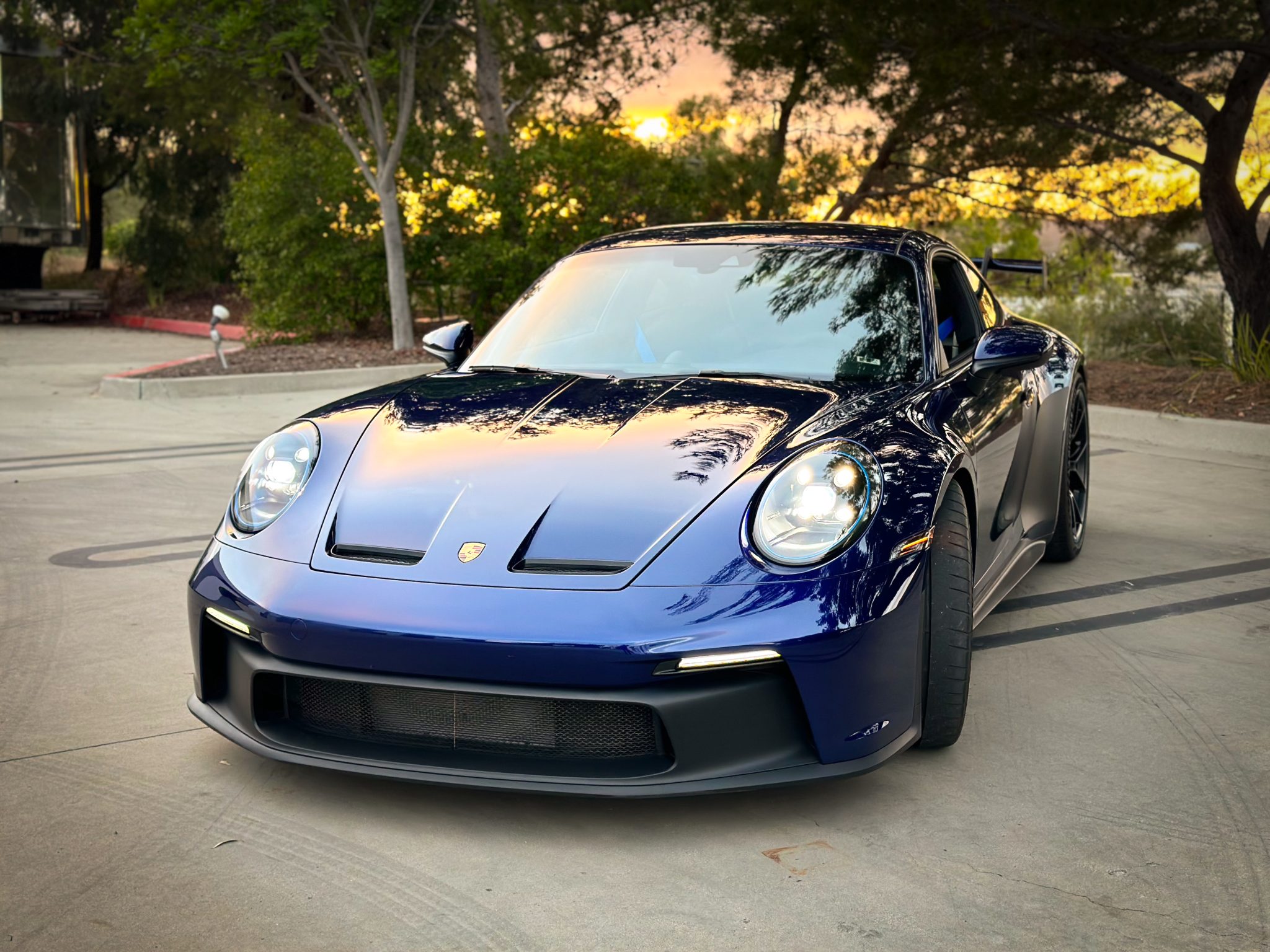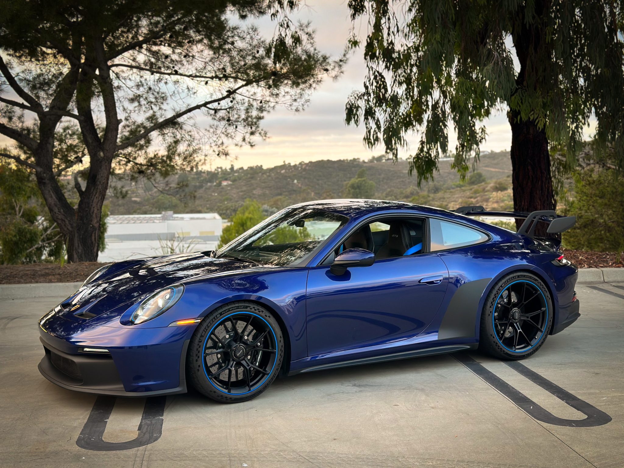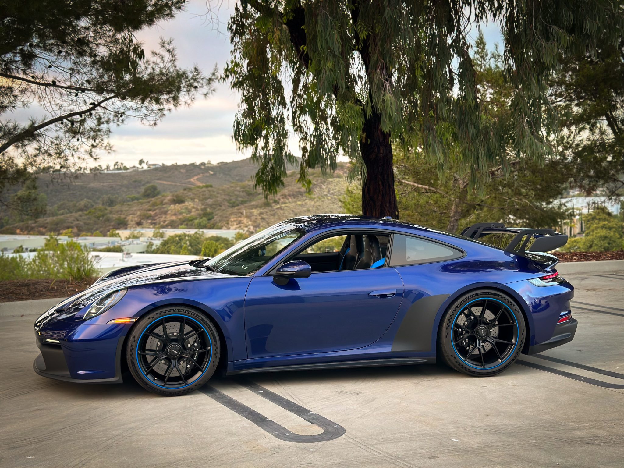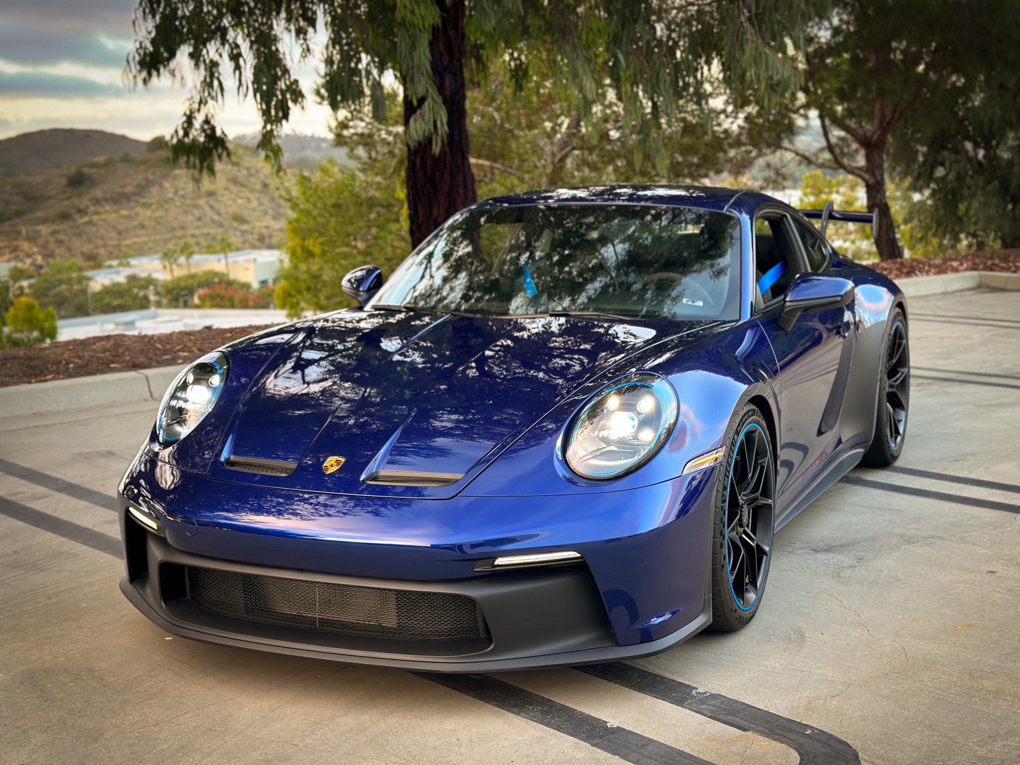 Satin Black-finished 20″ front and 21″ rear GT3 center-lock wheels feature Shark Blue accents and are mounted with Michelin Pilot Sport Cup 2 tires measuring 255/35 and 315/30, respectively. Stopping power is provided by Porsche Ceramic Composite Brakes (PCCB) with cross-drilled and ventilated discs at each corner. The car is equipped with a front-axle lift system and rear-axle steering. A brake fluid flush was reportedly performed in October 2023.