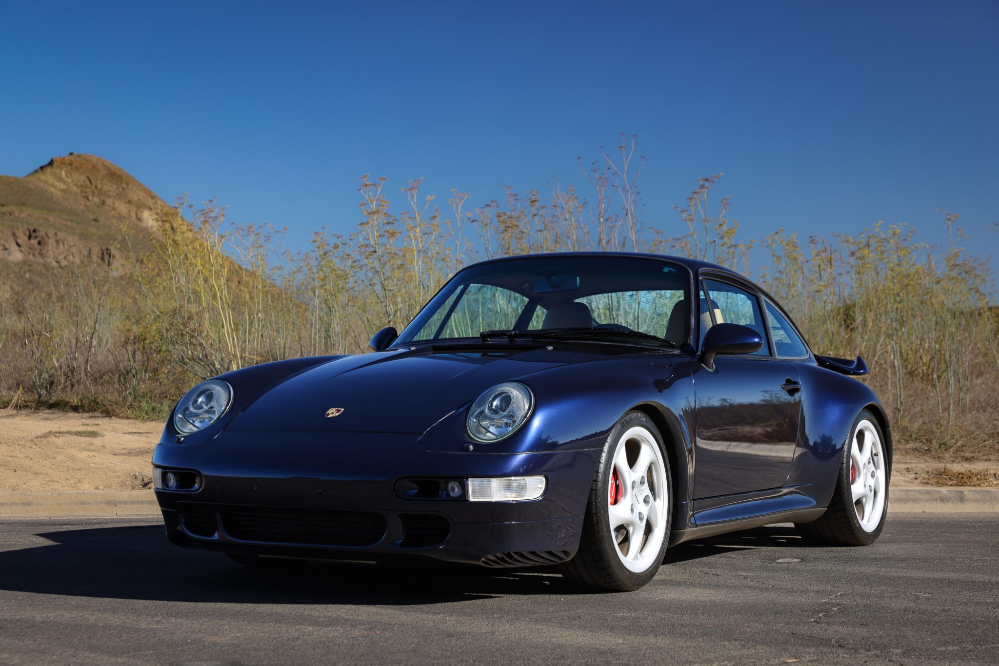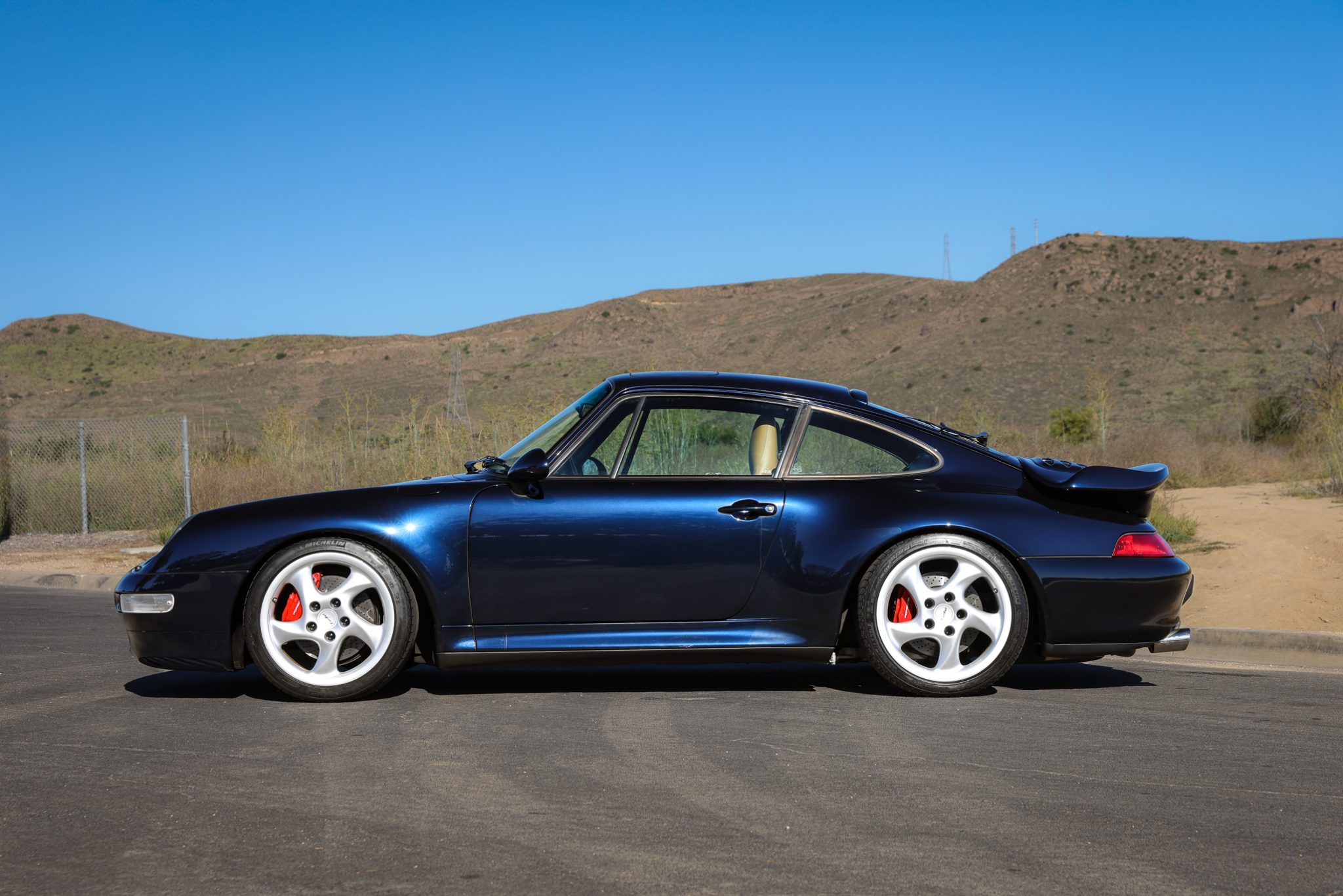 Silver-finished 18″ Turbo Twist wheels with solid spokes and Turbo script center caps are wrapped in 225/40 front and 285/30 rear Michelin Pilot Sport N3 tires showing 2021 date codes. The car features an Automatic Brake Differential (ABD) and has been fitted with Bilstein PSS10 coilovers. Braking is provided by red Porsche-branded four-piston calipers mounted over cross-drilled rotors.
