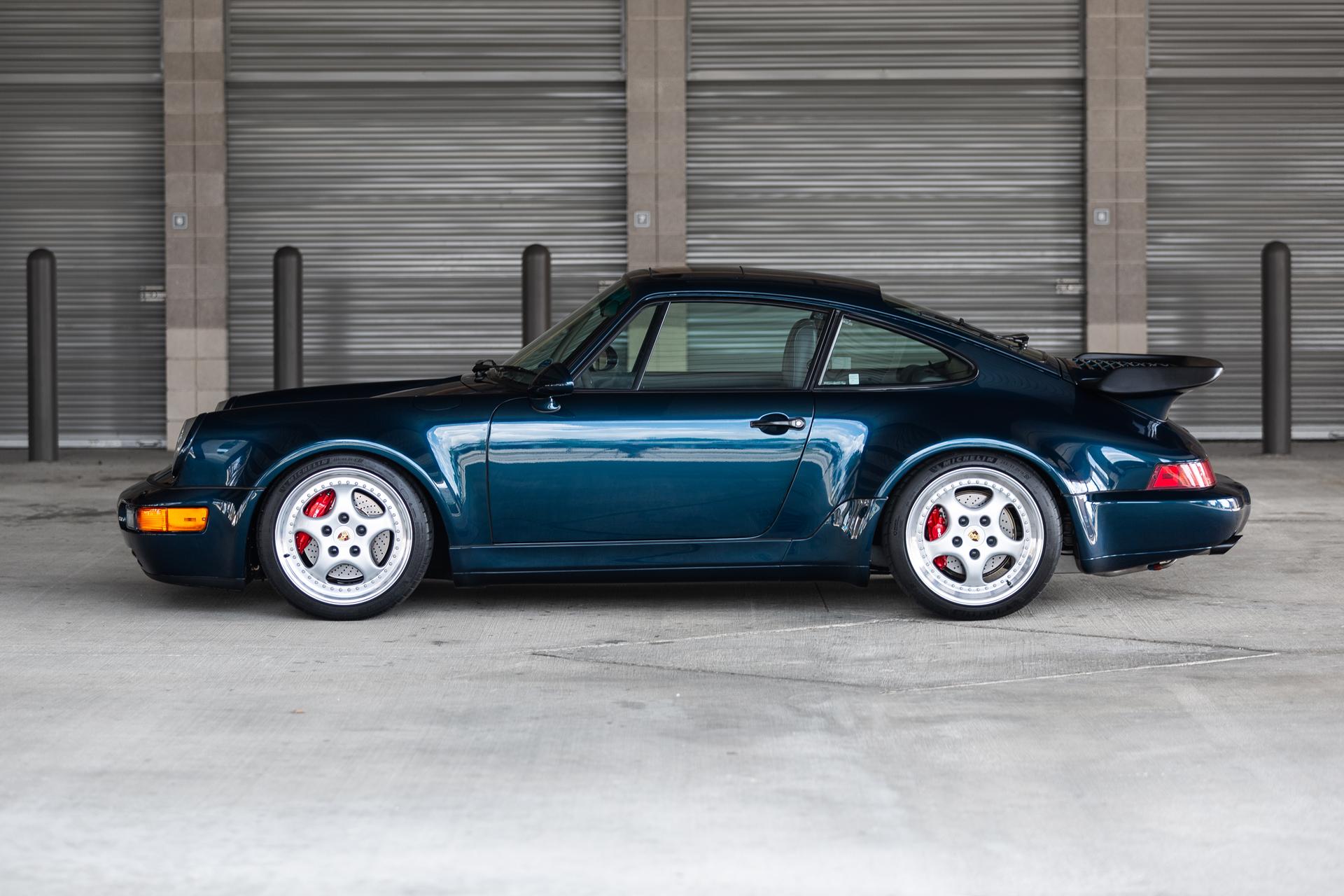 Multi-piece 18″ Speedline wheels were reportedly installed under previous ownership and are mounted with 225/40 front and 265/35 rear Michelin Pilot Sport tires that show date codes from 2021. The Turbo features uprated brakes compared to the standard 964, including larger calipers and cross-drilled rotors at each corner. The suspension was fitted with Bilstein PSS10 coilovers in 2021, at which time the front control arms were overhauled. Additional modifications included installing an ERP front bump-steer kit and rear spring plate set. A set of removed 17″ Cup 1 wheels are included and pictured in the gallery below.