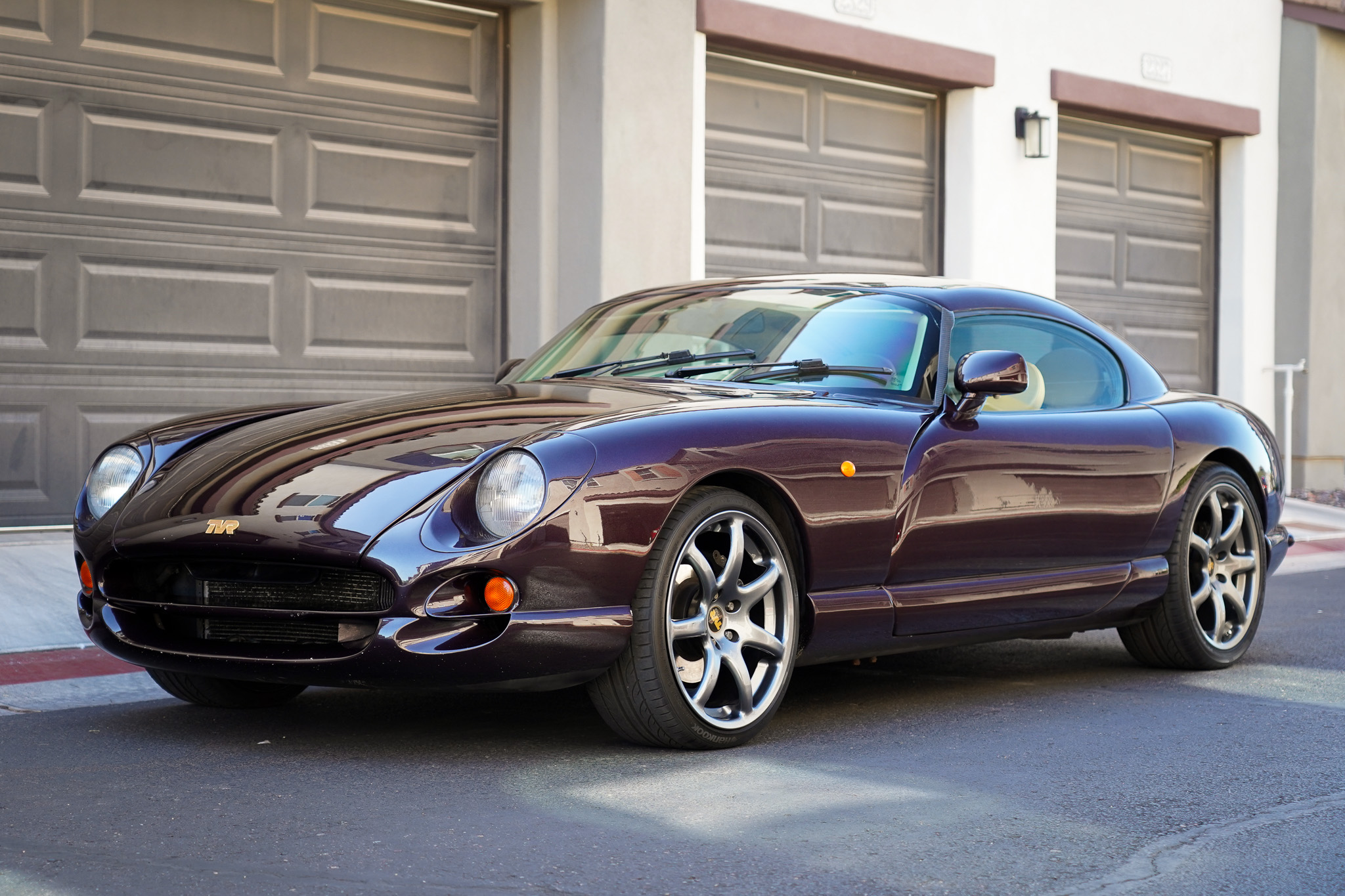 Silver-finished 18″ wheels feature TVR center caps and are mounted with 225/35 front and 255/35 rear Hankook Ventus V12 Evo2 tires. The fully independent suspension has been modified with GAZ coilovers, and the Cerbera was not offered with an anti-lock brake system or traction control. The hand brake cable was reportedly replaced in April 2022.