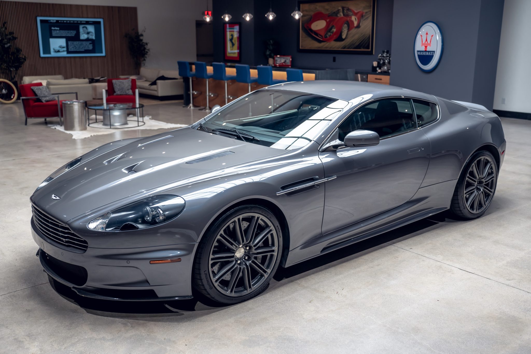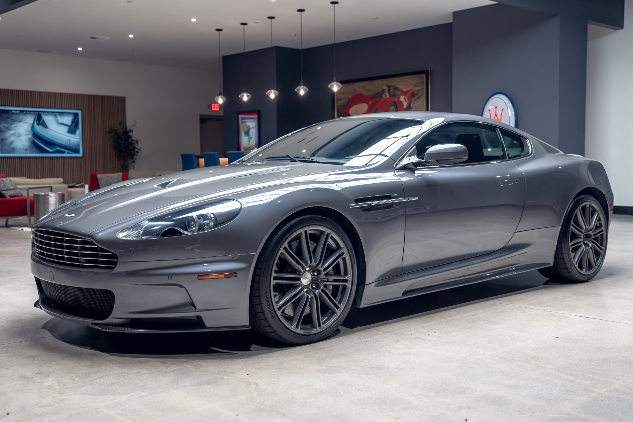 Gray-finished 20″ double-spoke alloy wheels are mounted with 245/35 front and 295/30 rear Continental ExtremeContact Sport tires. Stopping power is provided by black six-piston front and four-piston rear Aston Martin S-branded calipers over cross-drilled carbon-ceramic rotors at all four corners.