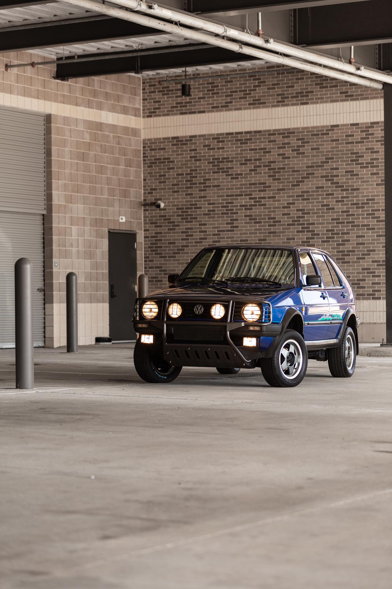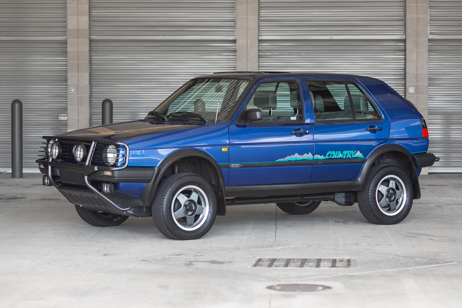 Speedline 15″ alloy wheels wear VW-branded center caps and are mounted with 215/60 BFGoodrich Radial T/A tires that show 2022 date codes, while a matching spare is affixed to a rear swing-out carrier. The Country rides on a lifted suspension when compared to the standard Mk2 Golf, and stopping power is provided by front disc and rear drum brakes.