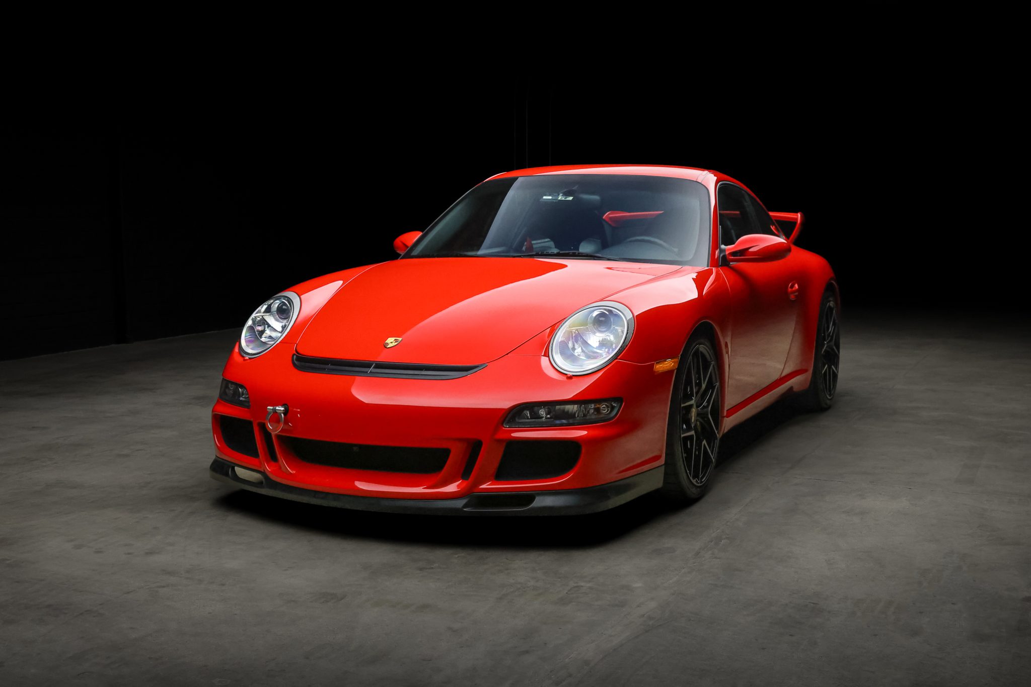 Aftermarket 19″ forged-magnesium wheels with Porsche-crest center caps are finished in black and mounted with 245/35 front and 305/30 rear Michelin Pilot Sport Cup 2 tires that have 2023 production-date codes. Braking is handled by yellow-finished Porsche-branded six-piston front and four-piston rear calipers over slotted Girodisc rotors. The GT3 was factory equipped with Porsche Active Suspension Management (PASM) featuring adjustable coilovers.