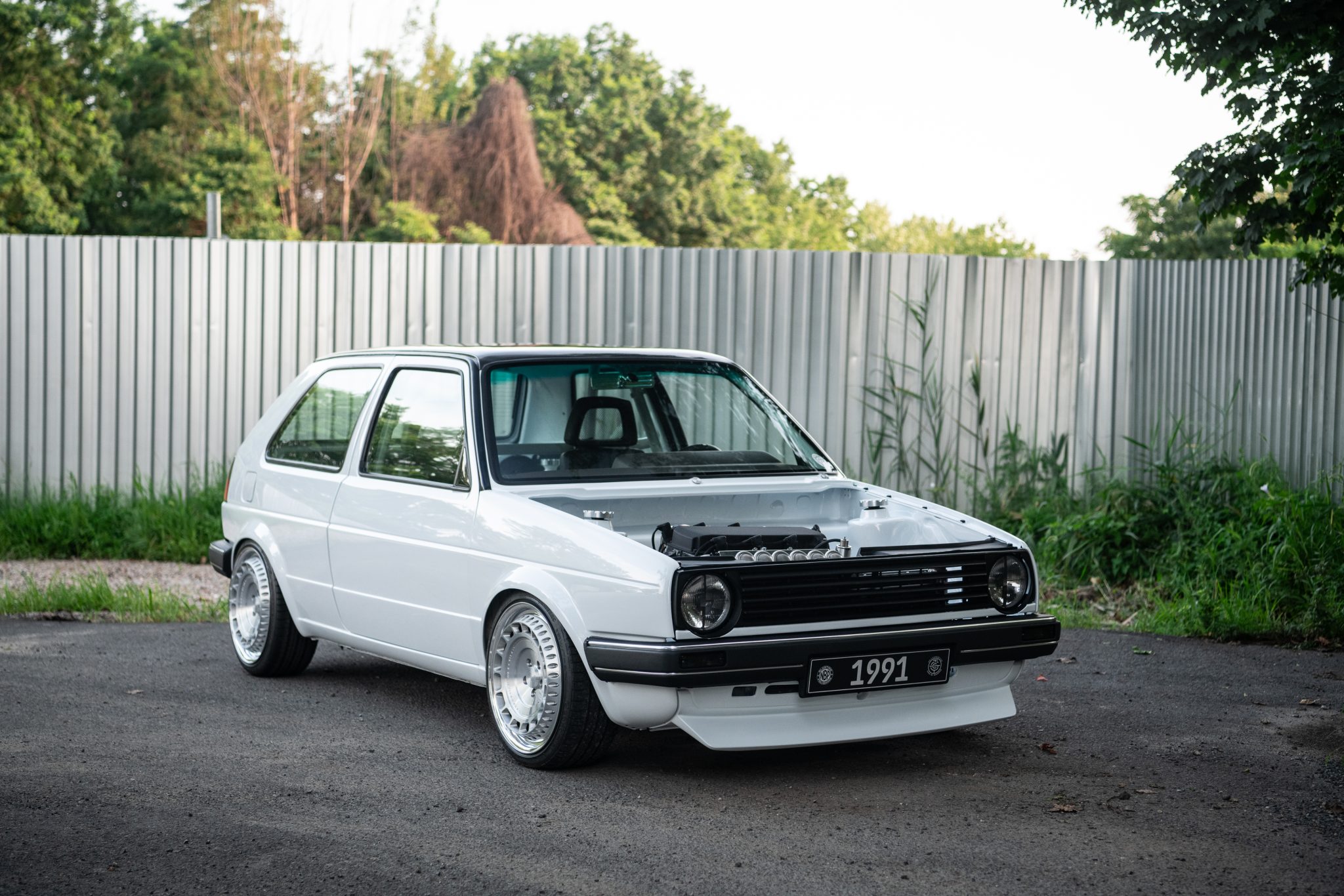Custom-made 17×7.5″ Rotiform wheels with machined faces and polished lips are mounted with 195/40 Achilles ATR-K Economist tires. H&R Ultra Low coilovers have been installed, and tubular control arms were fabricated for the car. Stopping power is provided by four-wheel disc brakes sourced from a MkIII Volkswagen.