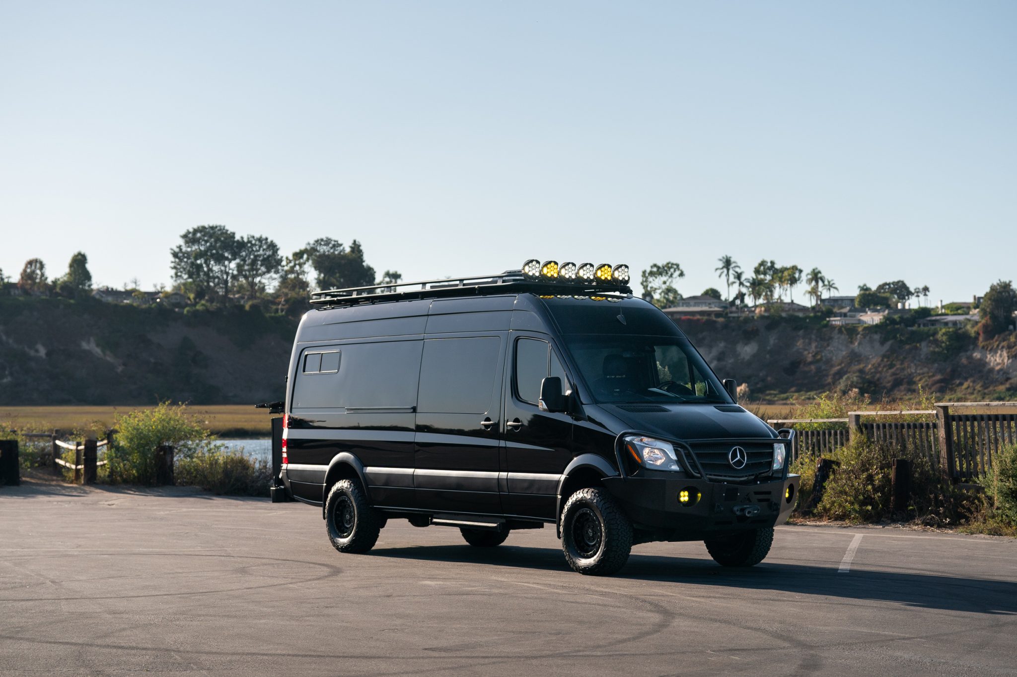 The van rides on a 170″ wheelbase with Roambuilt 17″ alloy wheels wrapped in 285/70 BFGoodrich All-Terrain T/A K02 tires, while a matching spare wheel is stored on a rear-mounted carrier. The suspension is said to have been lifted and modified by Agile Off Road of Santee, California, with Fox shocks at each corner and Deaver rear leaf springs. The Bilstein front struts and Hyperco springs were replaced in preparation for the sale, and the four-wheel disc brake system was serviced in May 2023 with replacement rotors, pads, and sensors.
