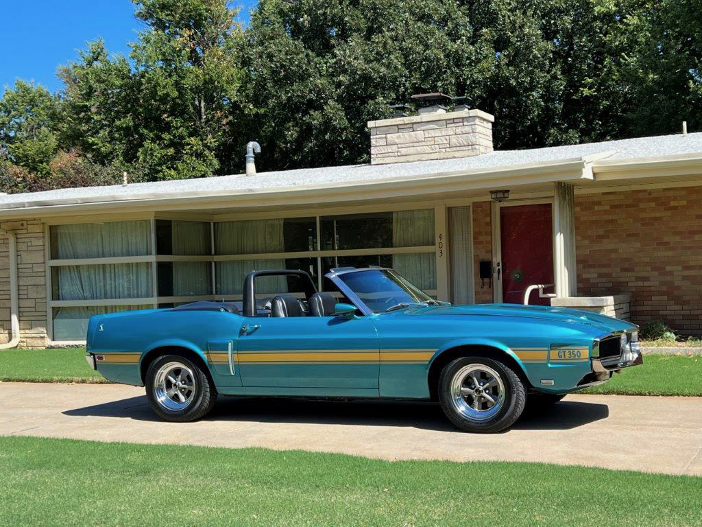 Gray 15″ five-spoke Shelby wheels feature polished lips and black Shelby center caps, and they are mounted with 235/60 Pirelli P600 tires that were installed in September 2019. A steel spare wheel with a space-saver spare is stowed in the trunk along with a jack, tools, and tire inflator can. Power-assisted steering and front disc brakes were optioned from the factory. The suspension was set to 1965 GT350 specifications by the seller in 2019, and replacement control arms, ball joints, Koni shocks, and front brake hoses were also installed. The steering idler arm, steering control valve, and power steering hoses were replaced in May 2023. A set of F60–15 Goodyear Polyglas GT tires is included in the sale and can be seen in the gallery.