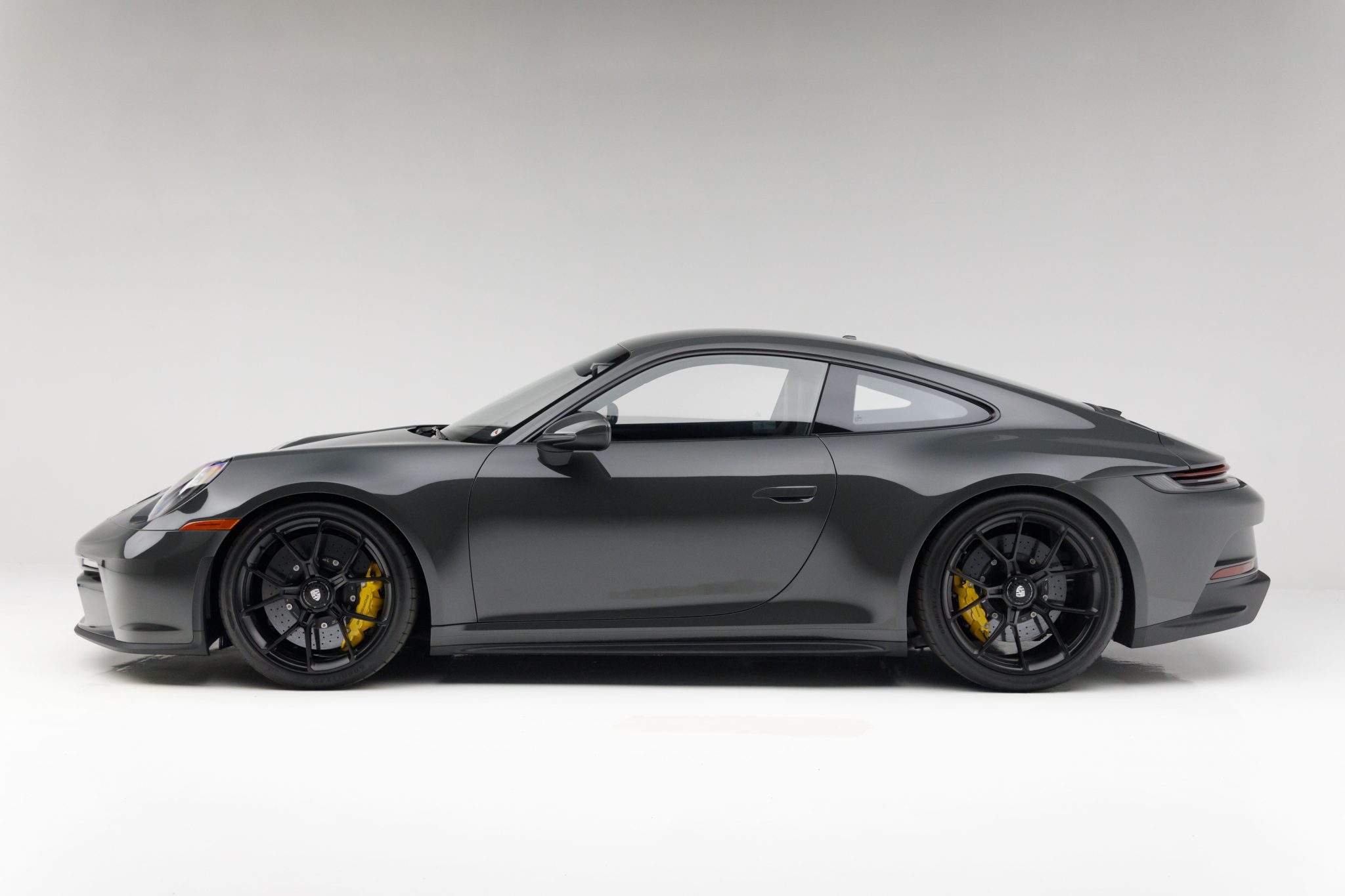 The 20″ front and 21″ rear GT3 center-lock wheels are mounted with 255/35 front and 315/30 rear Goodyear Eagle F1 tires. Stopping power is provided by Porsche Ceramic Composite Brakes (PCCB) with yellow calipers over cross-drilled and ventilated discs at each corner. The car is equipped with a front-axle lift system and rear-axle steering.