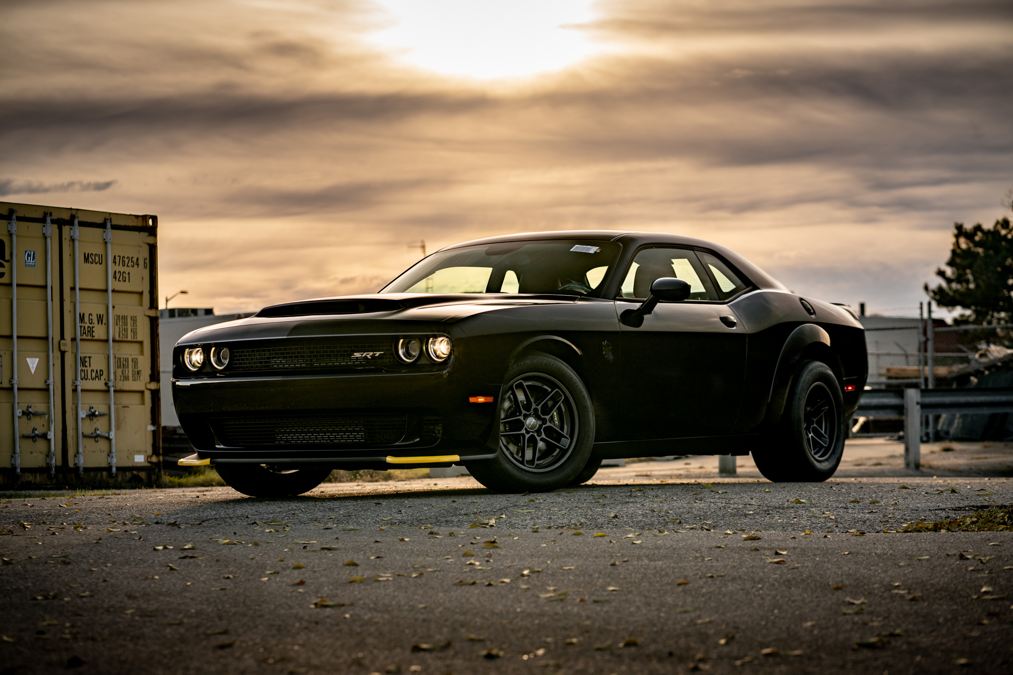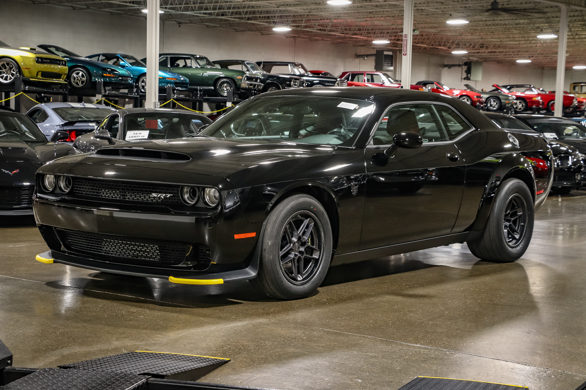 Optional 17″ and 18″ two-piece carbon-fiber wheels feature a forged aluminum center fastened together with titanium alloy hardware, and they are wrapped in 245/55 front and 315/50 rear Mickey Thompson ET Street R tires developed exclusively for the Demon 170. Stopping power is provided by black four-piston Brembo calipers with yellow SRT lettering over ventilated discs. The Demon 170 is equipped with a unique Drag Mode suspension with adaptive-damping shocks as well as launch control, a line lock, and a revised transbrake.