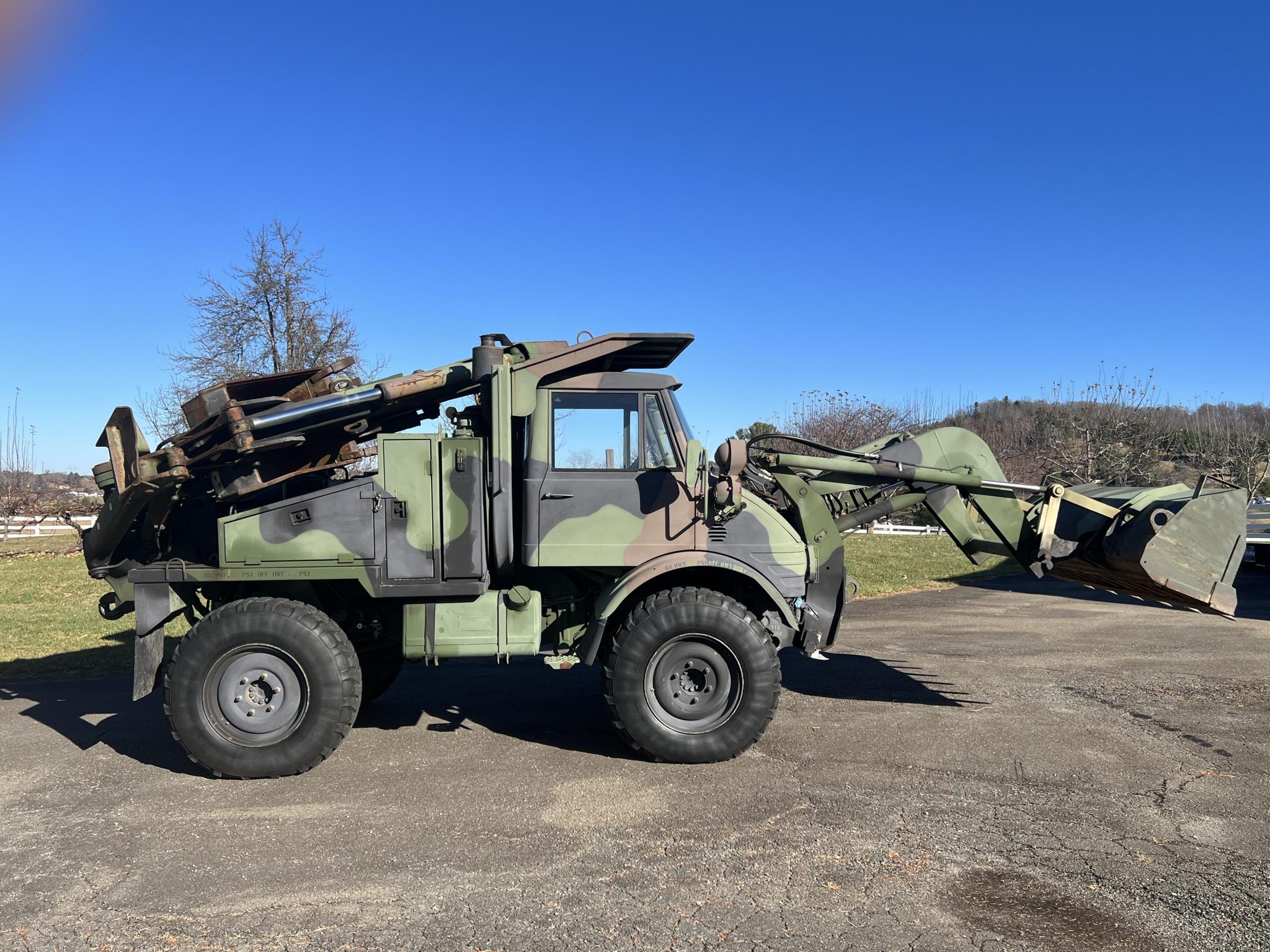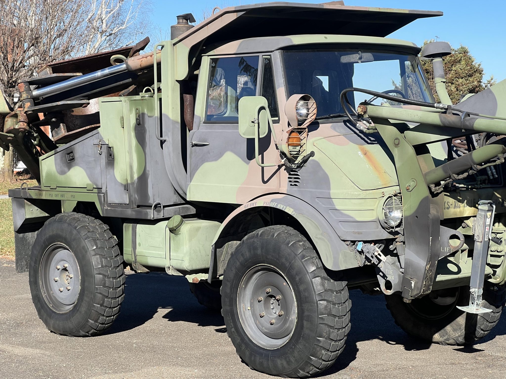 Black-finished 20″ steel wheels are mounted with Michelin X tires that show dry cracking. An air leak is present from one of the rear tires, and a spare wheel and tire is mounted between the cab and the bed. Braking is handled by four-wheel discs and the seller states the parking brake needs adjustment.