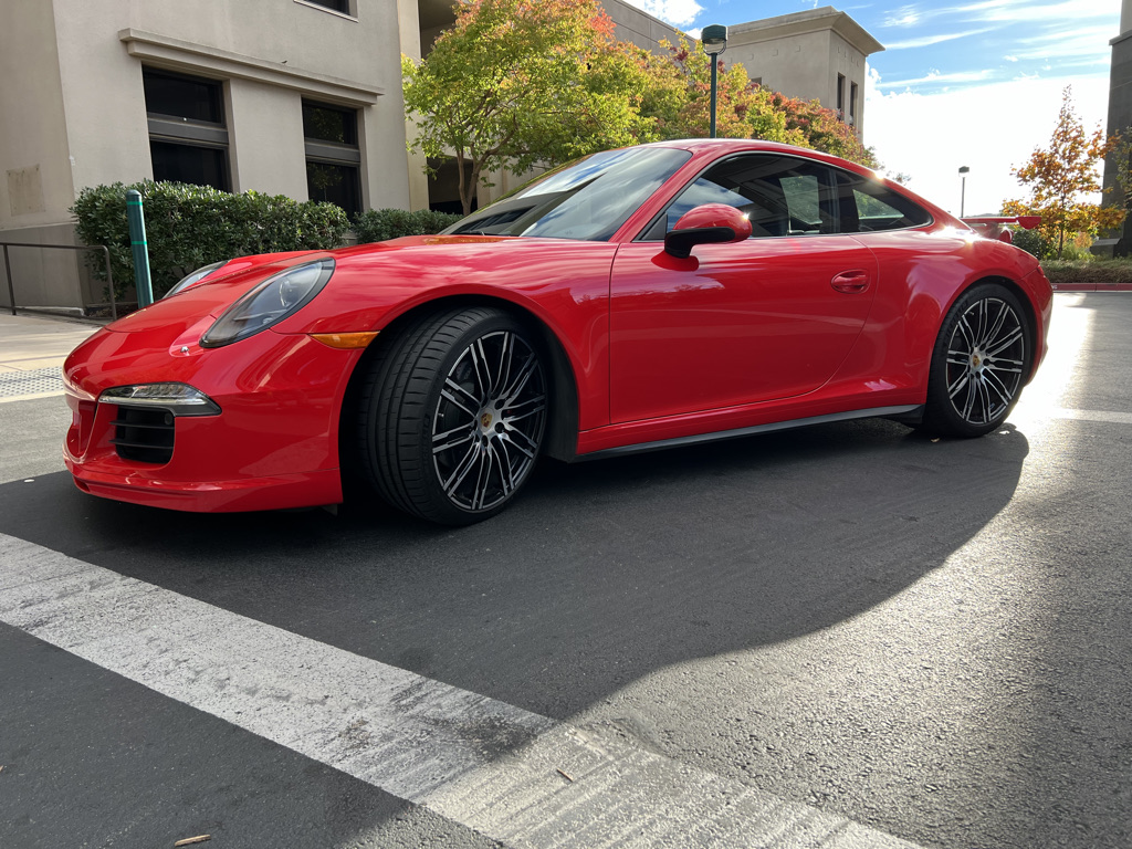 The 20″ 911 Turbo alloy wheels are mounted with 245/35 front and 305/30 rear Michelin Pilot Sport 4s tires showing 2022 date codes. Braking is handled by red-painted Porsche-branded calipers over cross-drilled and ventilated discs. The car is equipped with Porsche Active Suspension Management (PASM) sport suspension, Power Steering Plus, and Porsche Dynamic Chassis Control (PDCC), and the seller notes the ride height has been lowered.