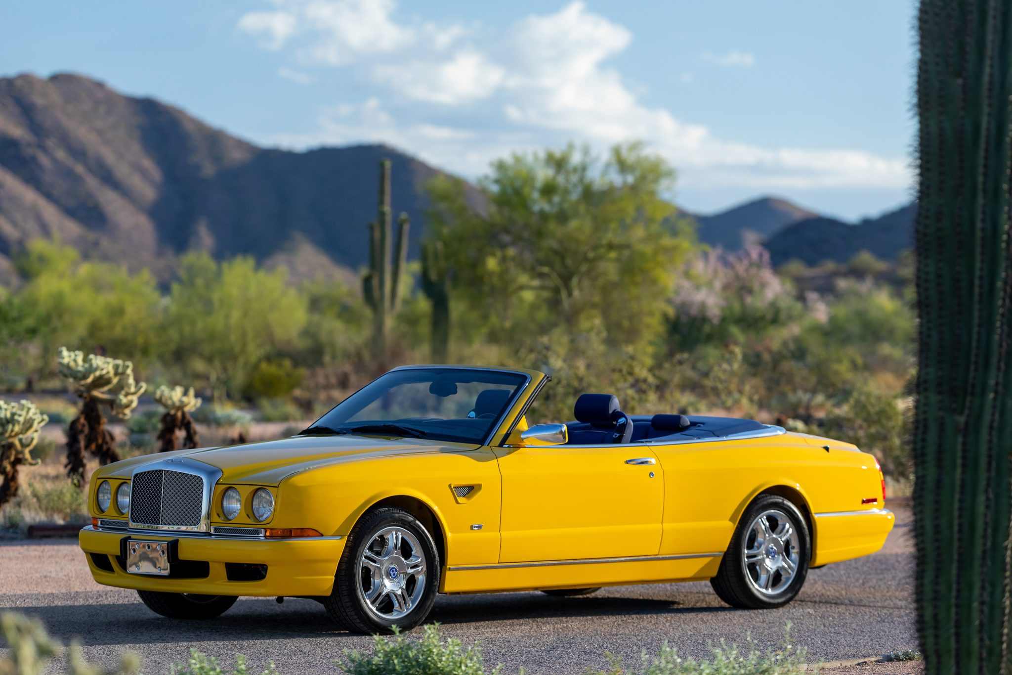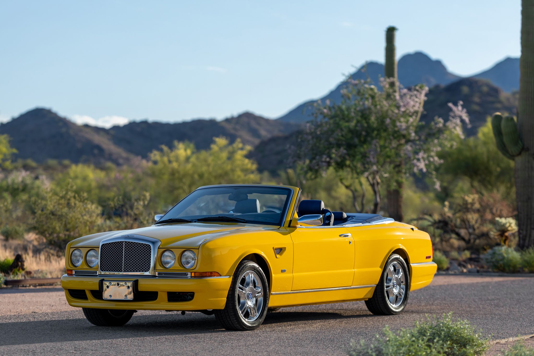 Chrome 18″ five-spoke wheels wear Bentley-branded center caps and are mounted with 255/50 Pirelli P Zero Rossa tires. Stopping power is provided by disc brakes at all four corners with slotted rotors and dual calipers up front. Damage is visible on the right-rear wheel.