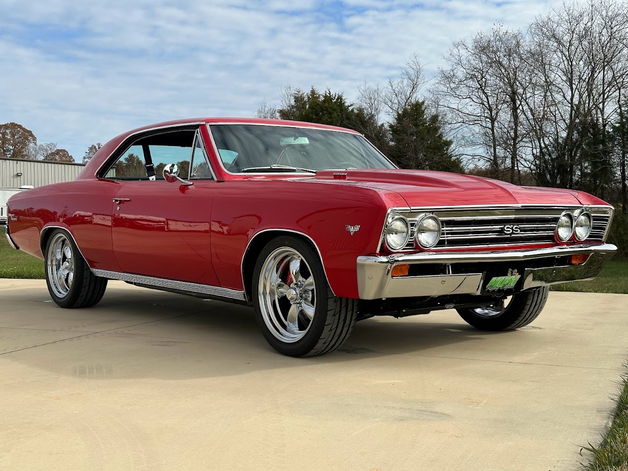 The chrome-finished 18″ American Racing Torq Thrust wheels are wrapped in 245/45 front and 275/40 rear Firestone Firehawk Indy 500 tires. The suspension has been modified with tubular front A-arms, Koni adjustable shocks, and Detroit Speed sway bars. Stopping power is provided by Wilwood disc brakes with red-finished calipers over cross-drilled rotors at all four corners.