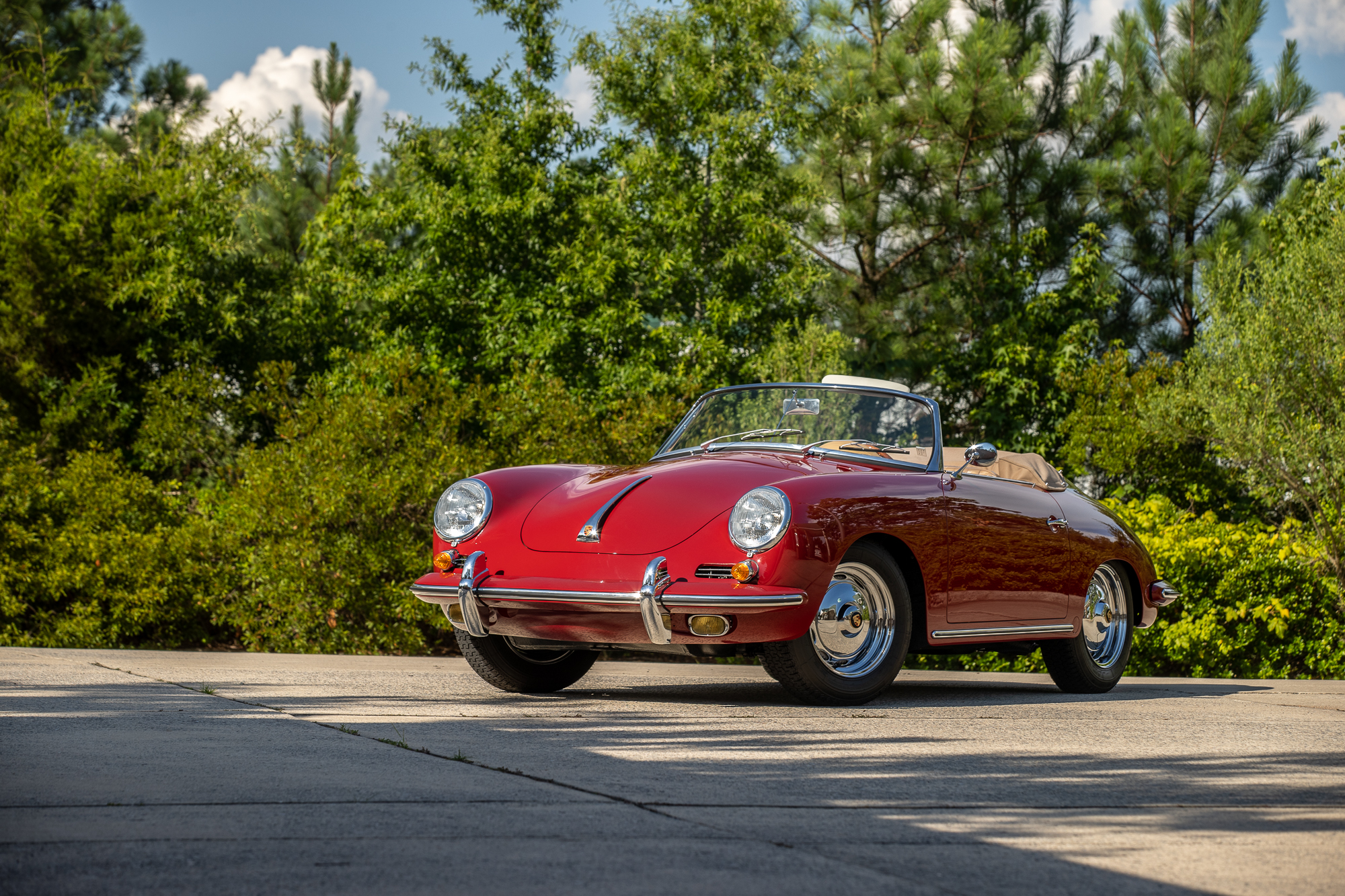Delivered from the factory in Ruby Red (6202), this example is said to have been stripped to bare metal and received replacement floor pans and bodywork before it was repainted in its current shade of red during the 2000s refurbishment. Features include body-color bumpers with chrome overriders, yellow-lens foglights, a driver-side mirror, a tan soft top, gold badging, and dual exhaust outlets exiting through the rear bumperettes. Body stampings on the front trunk lid hinge can be seen in the gallery below.