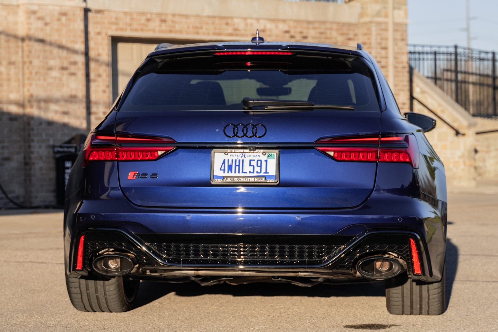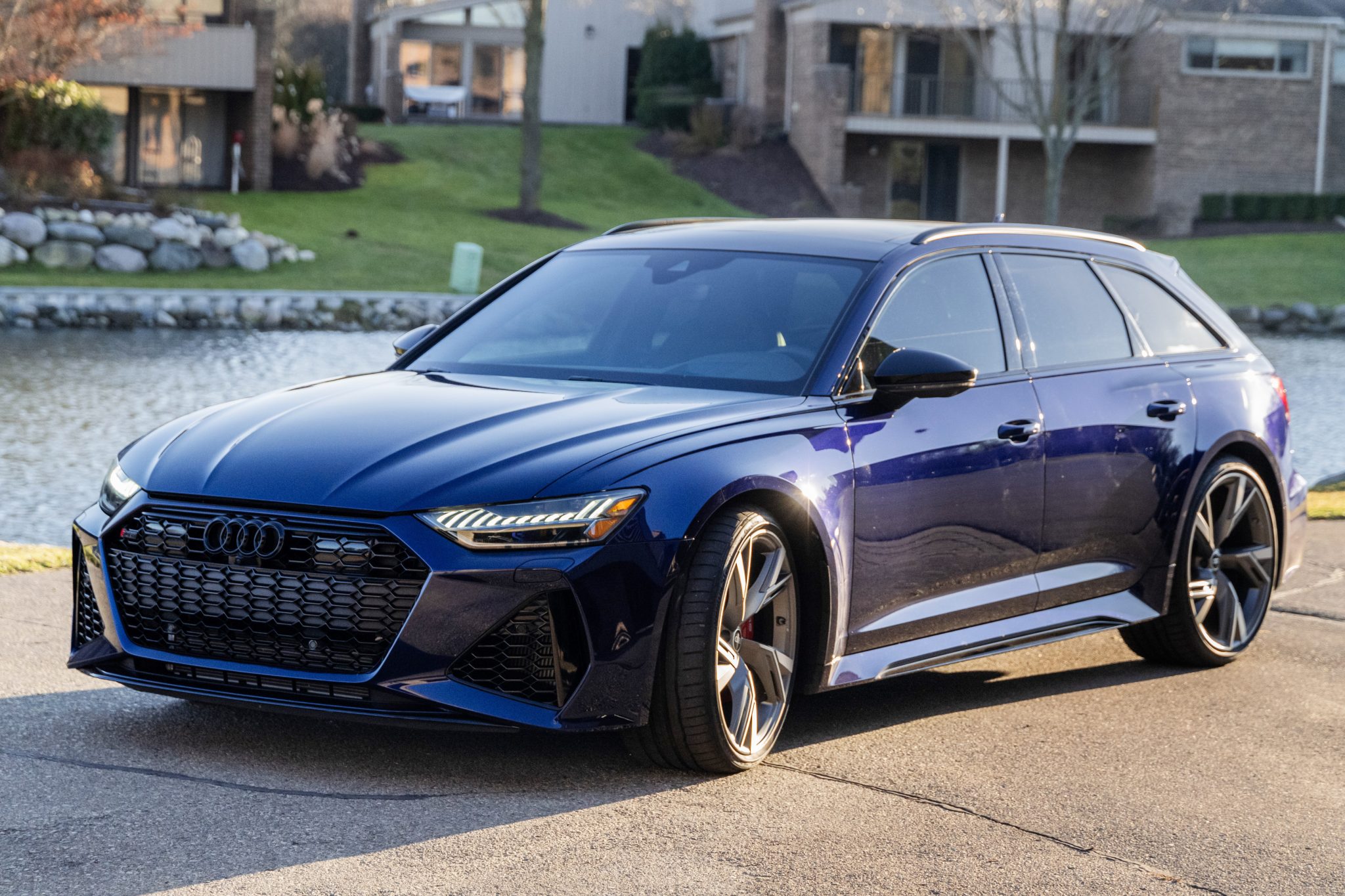 Optional five-V-spoke 22″ wheels are mounted with 285/30 Hankook Ventus S1 Evo 3 tires. The car is equipped with adaptive air suspension with selectable automatic level control, and braking is handled by red-finished RS-logo calipers mounted over cross-drilled rotors. A chip on the front-right wheel is shown in the video gallery.