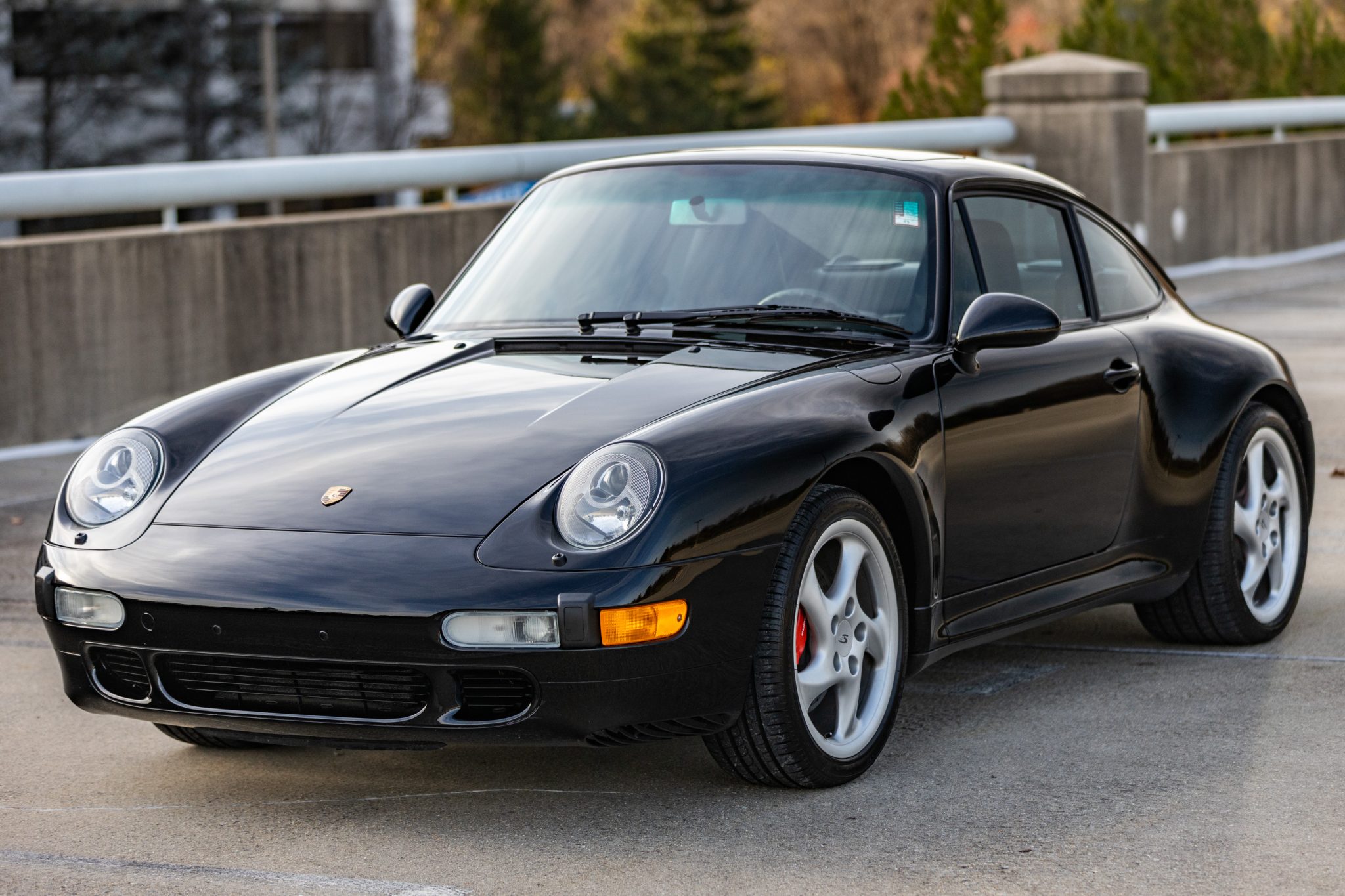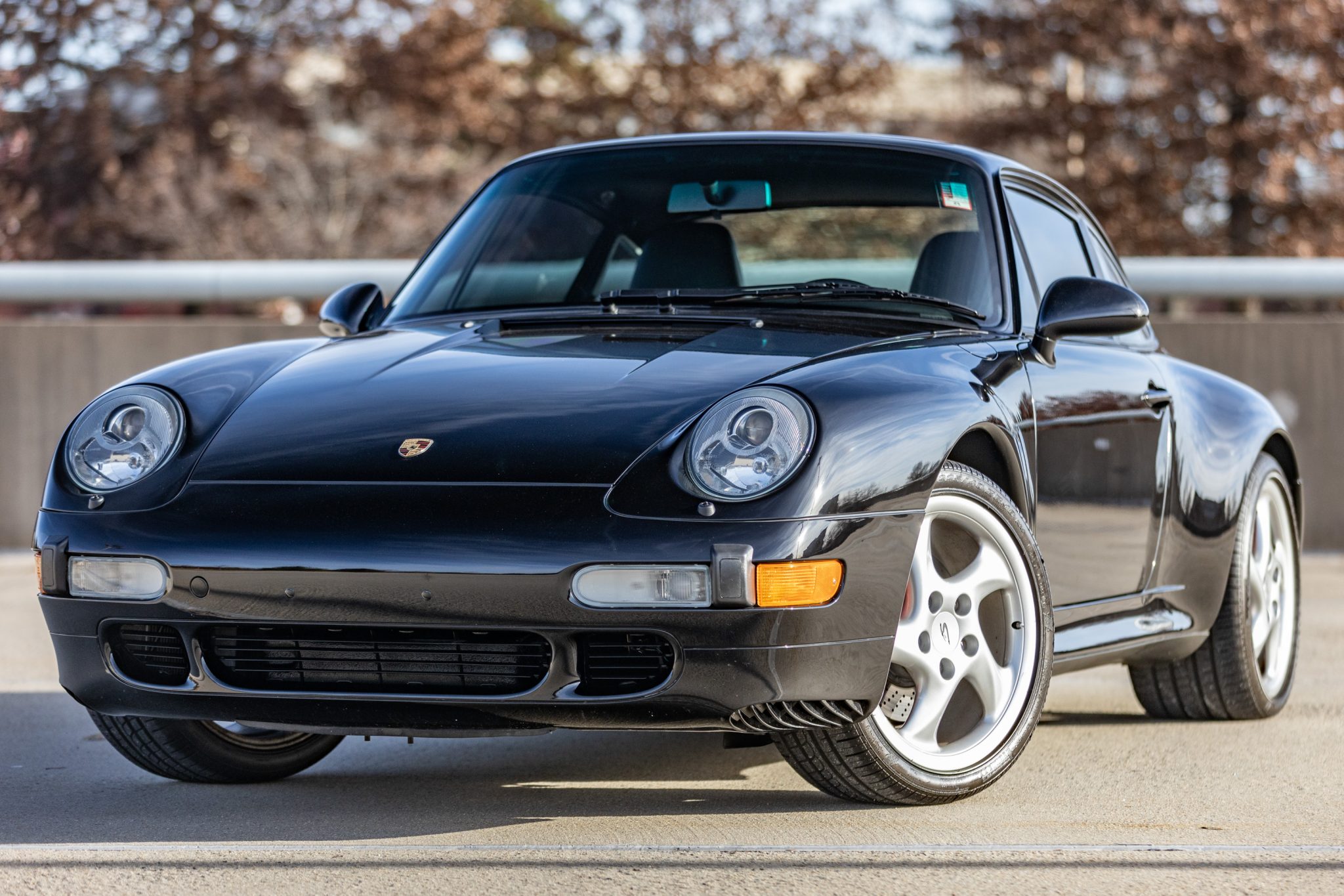 The 18″ Turbo Twist wheels are mounted with 225/40 front and 285/30 rear Pirelli P Zero Rosso tires. The car features an Automatic Brake Differential (ABD), and the 993 was the first 911 to feature multi-link rear suspension. Braking is handled by red-finished Porsche-branded calipers over cross-drilled rotors at all four corners.