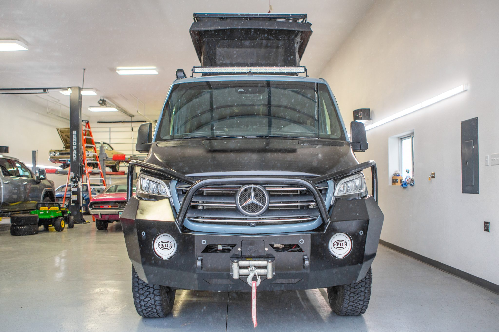 Black Rhino 17″ alloy wheels are mounted with 275/70 Firestone Destination X/T tires, and a spare is mounted to the rear of the van. The Sprinter comes standard with Active Brake Assist, Load-Adaptive Electronic Stability Control, and Crosswind Assist. Stopping power is provided by four-wheel anti-lock disc brakes.