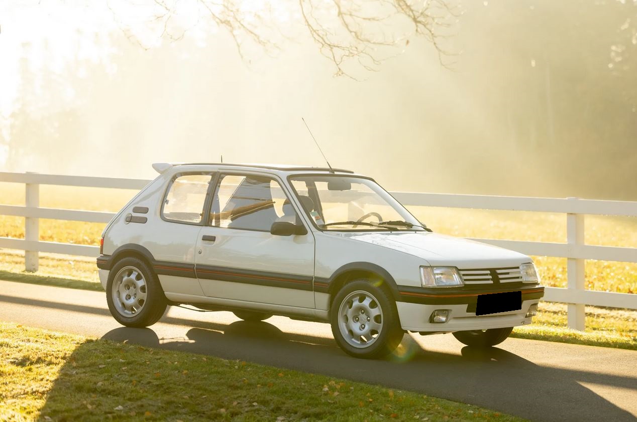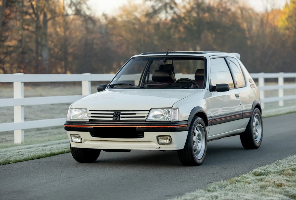 Silver 15″ Speedline alloy wheels are mounted with 185/55 Michelin Pilot Exalto tires, while a non-matching spare is affixed to the underside. The 205 GTi featured sport-tuned suspension and four-wheel disc brakes. An aftermarket rear strut tower brace has been installed, and the brake pads are said to have been replaced in preparation for the sale.