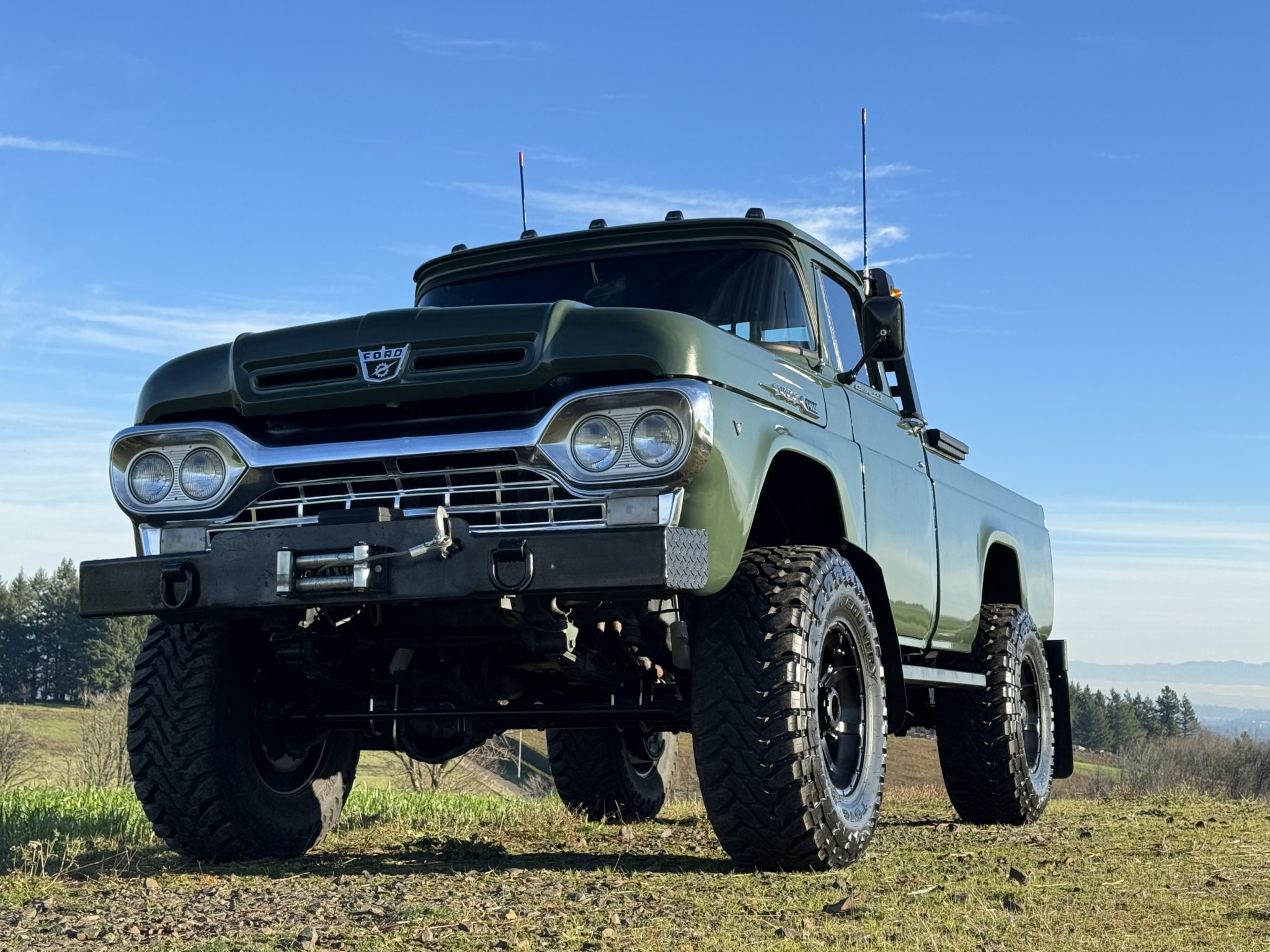 The black-finished 18″ Ultra Motorsports wheels are mounted with 37×13.5″ Toyo Open Country M/T tires. The truck rides on a 3″ lifted suspension and is equipped with power steering as well as manually locking Mile Marker front hubs. Braking is handled by front discs and rear drums, though the selling dealer notes that the parking brake is inoperative.