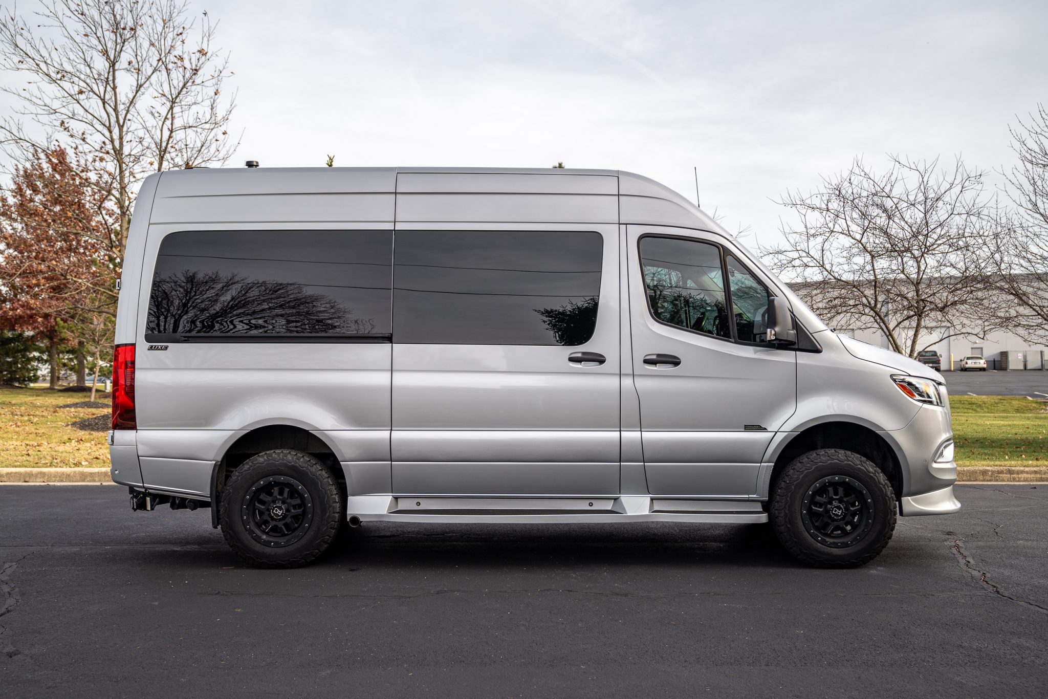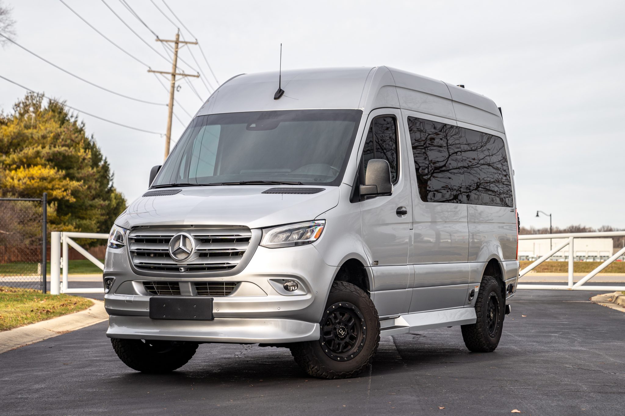 Black-finished 17″ Black Rhino alloy wheels with simulated beadlocks were mounted with 245/75 BFGoodrich All-Terrain T/A K02 tires in May 2023, and a matching spare is affixed to the rear carrier. The van rides on an independent front suspension and a solid rear axle, and braking is handled by discs at all four corners.