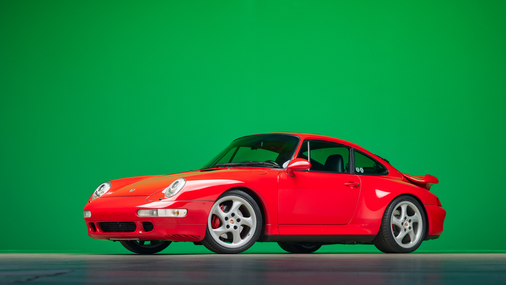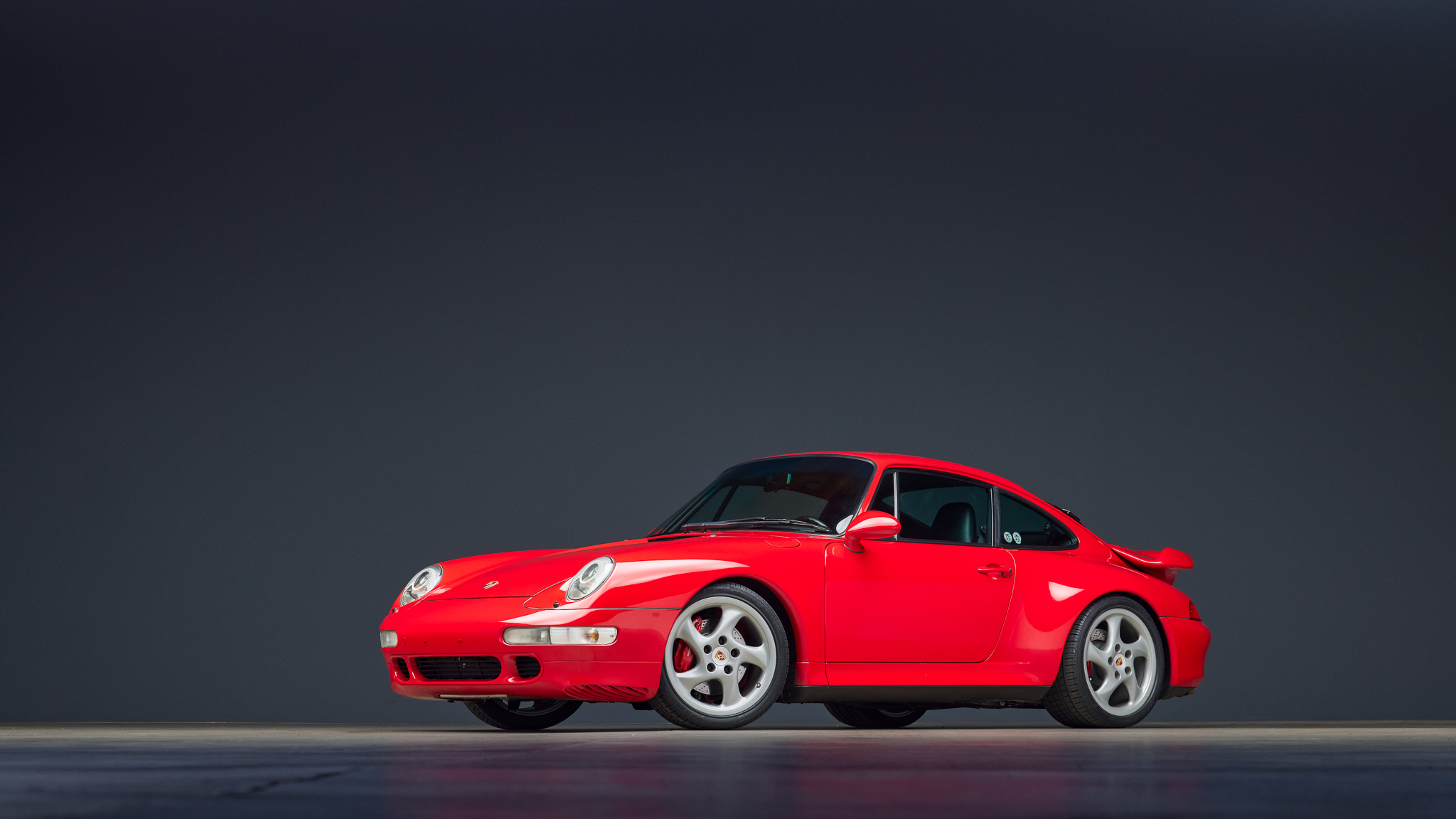 The 18″ hollow-spoke Technology wheels have been refinished in Steel Grey, and the Arctic Silver center caps show full-color Porsche crests. Pirelli P Zero Rosso tires were mounted in preparation for the sale. The car features an Automatic Brake Differential (ABD), and the 993 was the first 911 to feature multi-link rear suspension. Braking is provided by Porsche-branded four-piston calipers over cross-drilled rotors.