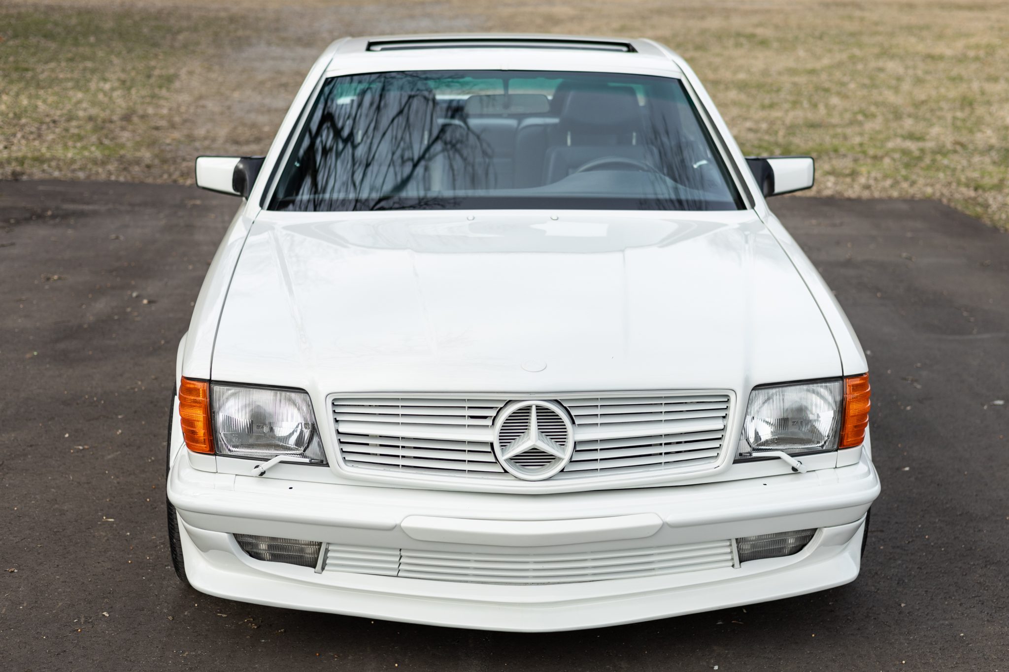 Staggered-width 16″ Penta wheels wear AMG center caps and are mounted with 225/50 and 245/45 Pirelli P Zero Rosso tires. The car has been fitted with 560SE disc brakes, Dkubus adjustable height springs, and Bilstein dampers. The steering box, tie rod ends, and suspension bushings were reportedly replaced during the engine swap.