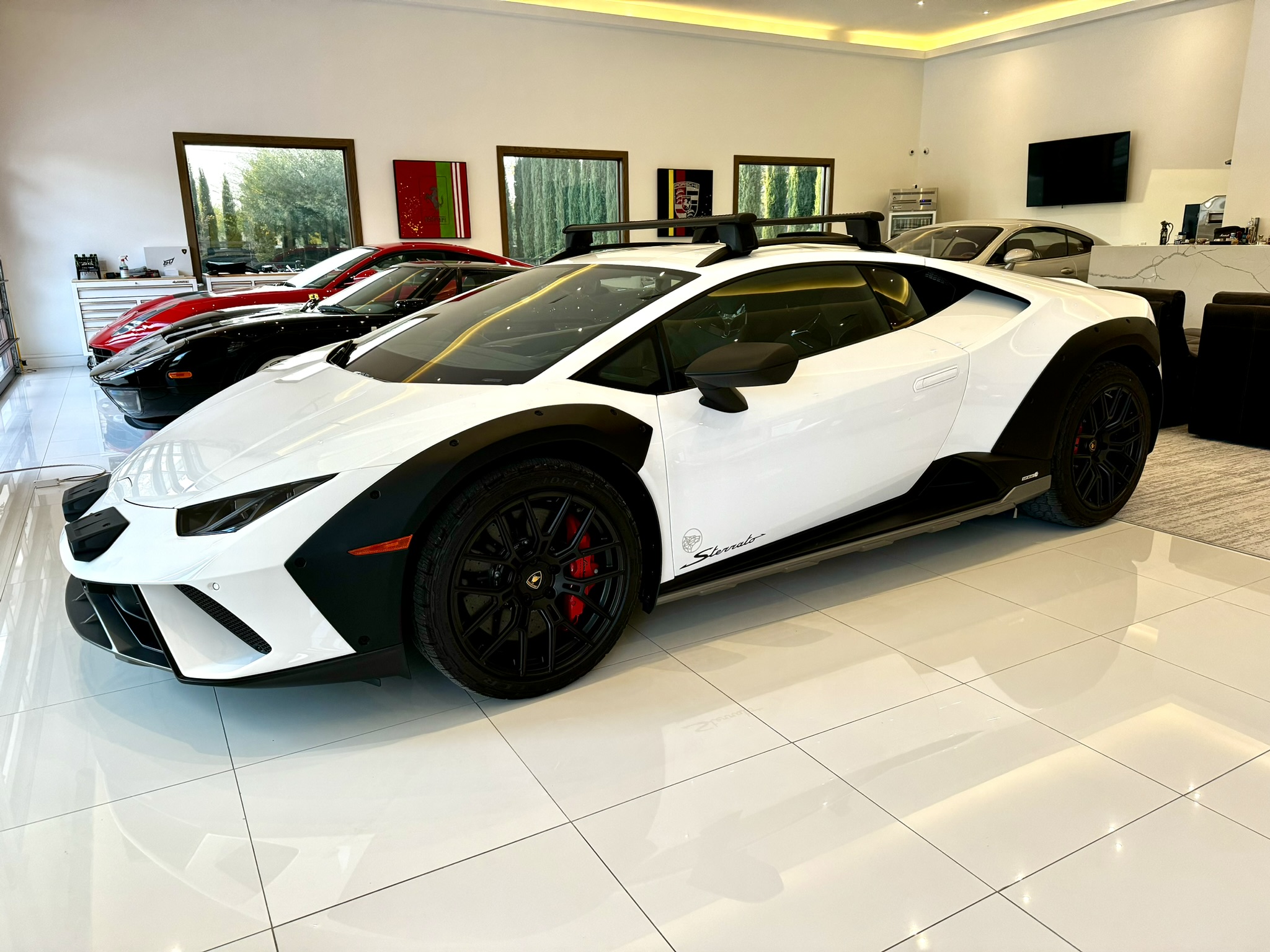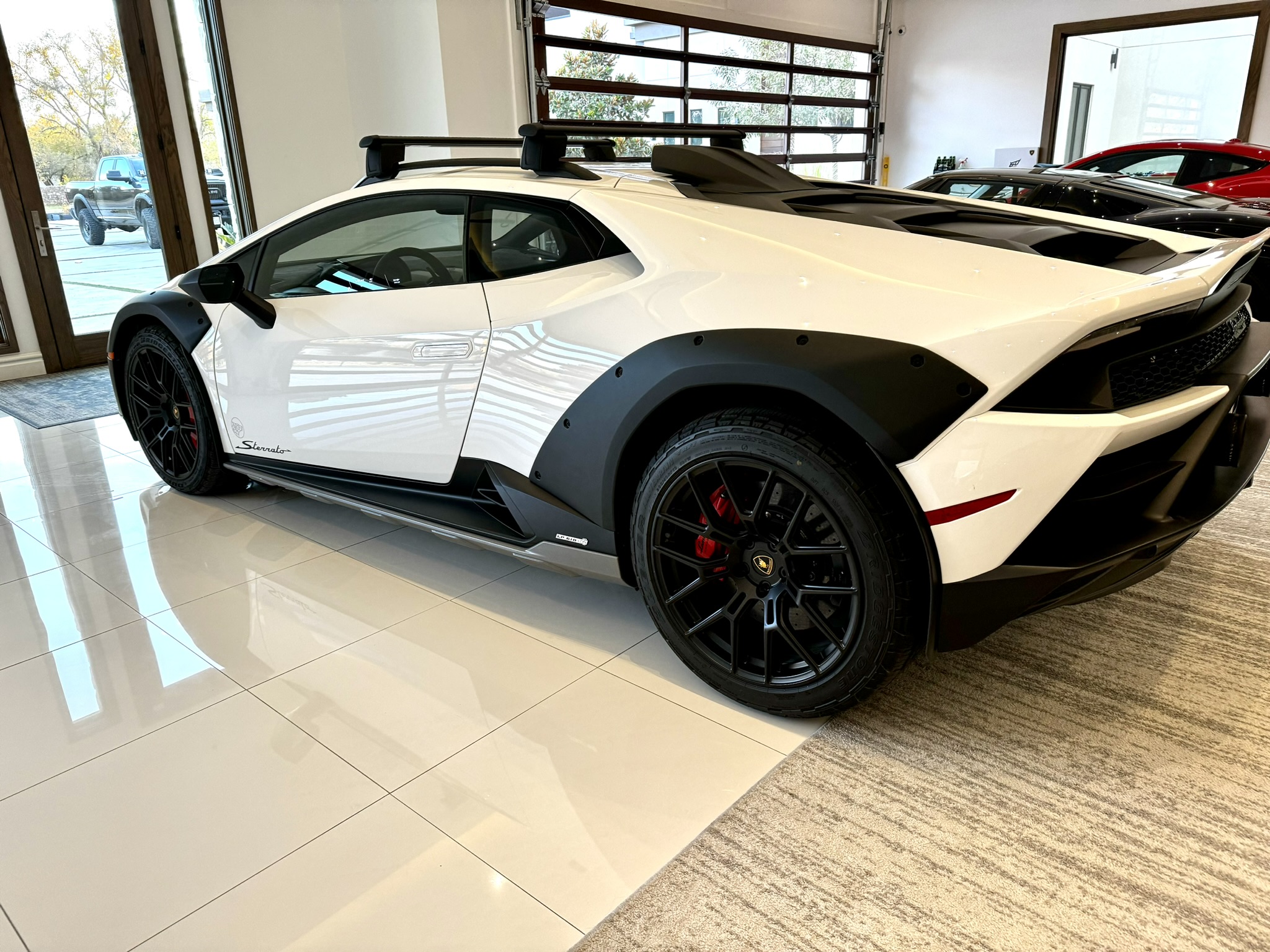 Black-finished Morus 19″ alloy wheels are mounted with 235/40 front and 285/40 rear Bridgestone Dueler All-Terrain run-flat tires. Braking is handled by red-painted Lamborghini-branded calipers over cross-drilled carbon-ceramic rotors at all four corners. The Sterrato features a ride height approximately 1.7″ higher than the Hurácan Evo, and the car is equipped with the Lamborghini Dinamica Veicolo Integrata (LDVI) system which controls the torque vectoring, traction control, and all-wheel drive systems. The ANIMA system provides three dynamic driving modes, including the Sterrato-specific Rally mode which is designed for low-traction conditions.