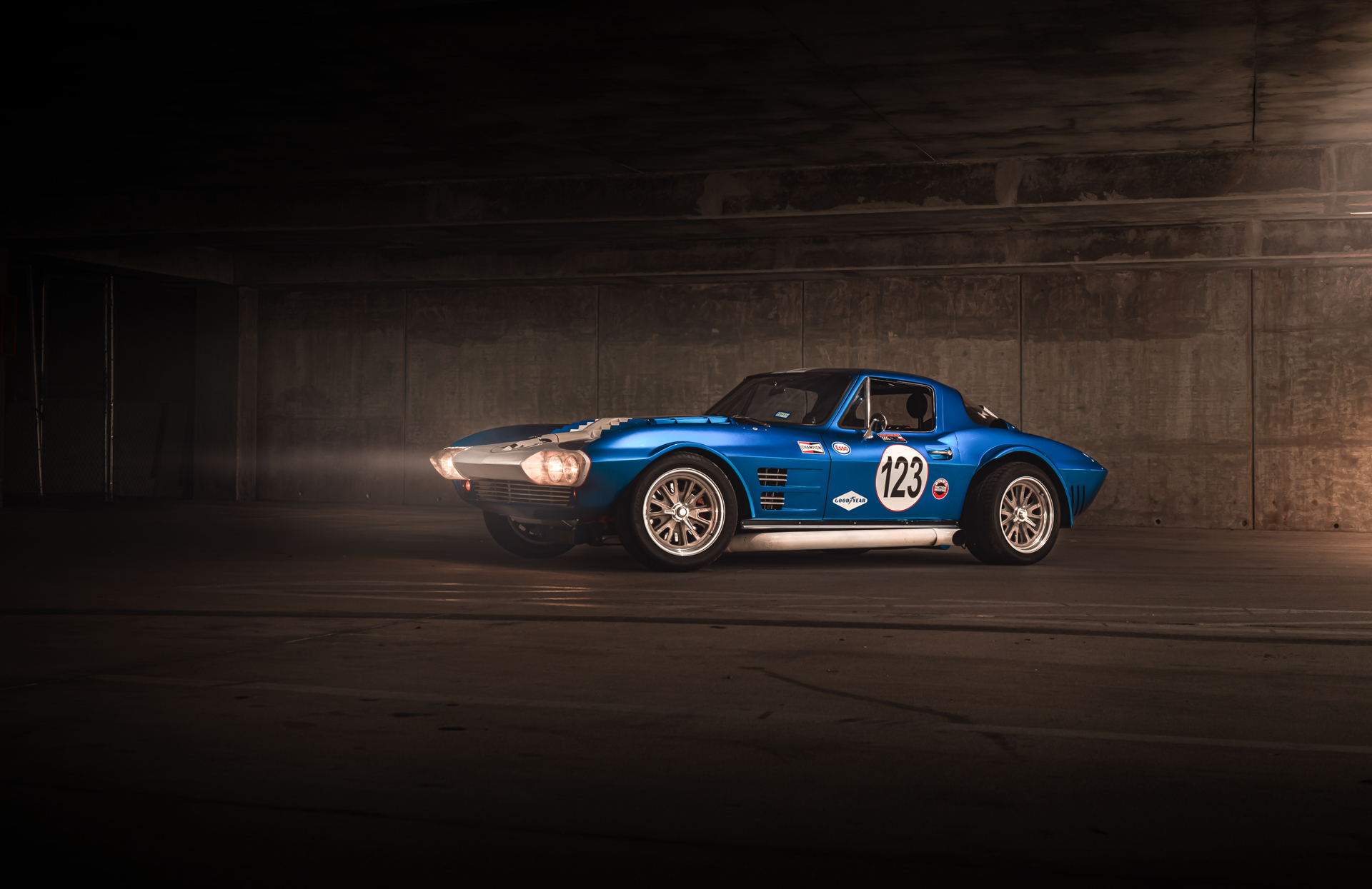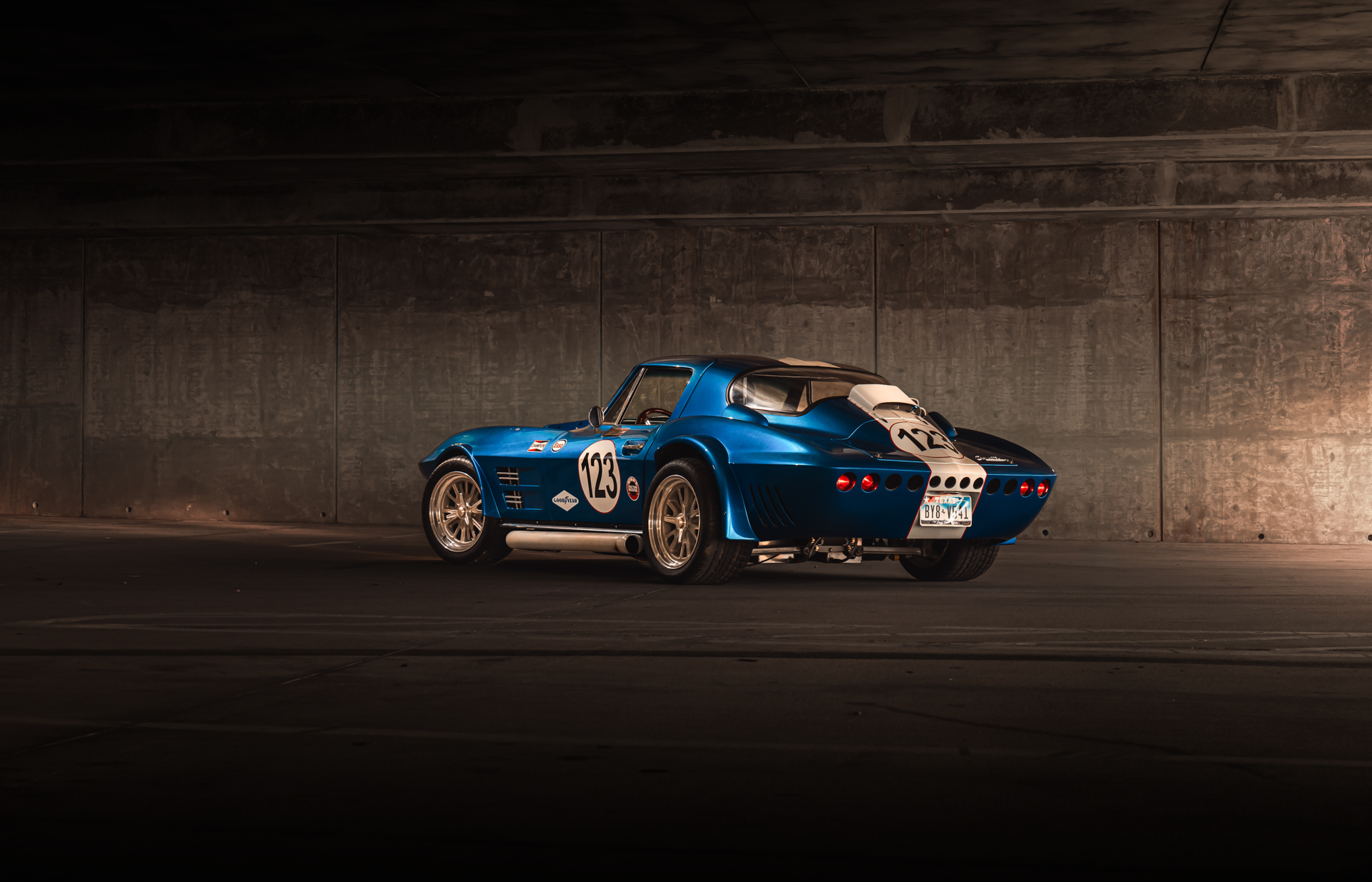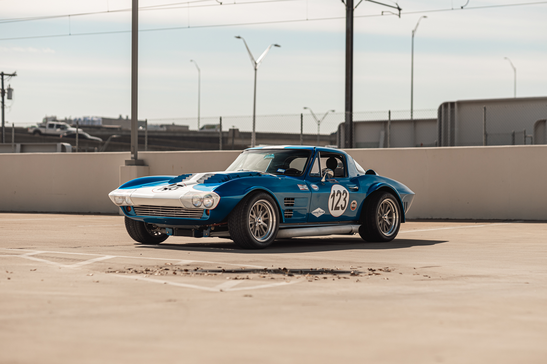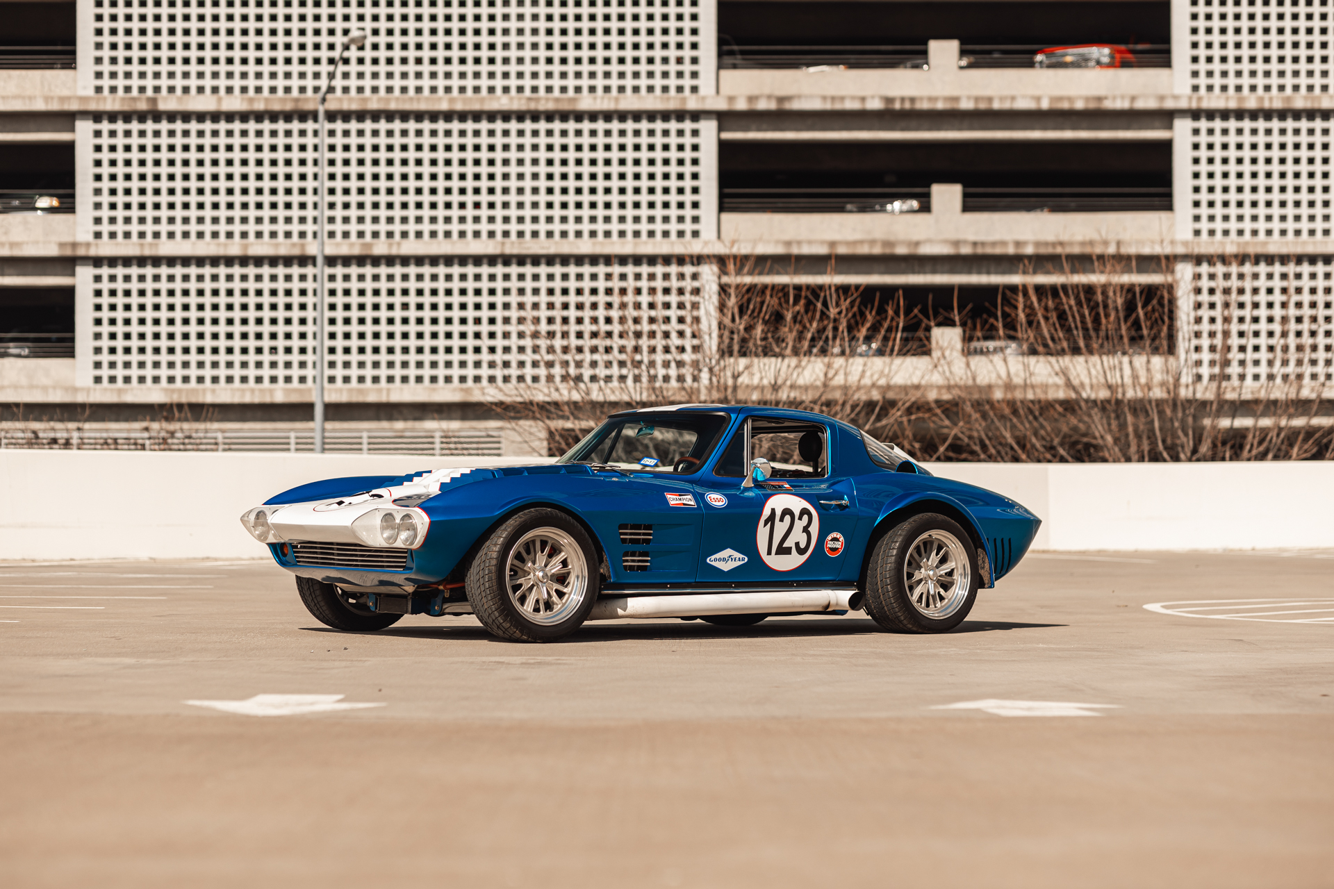 Halibrand-style PS Engineering 17″ wheels wear spinner center caps and are mounted with 275/40 Sumitomo HTR 40Z front tires and 315/35 Sumitomo HTR 35Z rear rubber. The car is underpinned by a tube-frame chassis and C4 Corvette suspension components as well as custom coilovers and Bilstein shocks. Disc brakes with red calipers are positioned at all four corners.