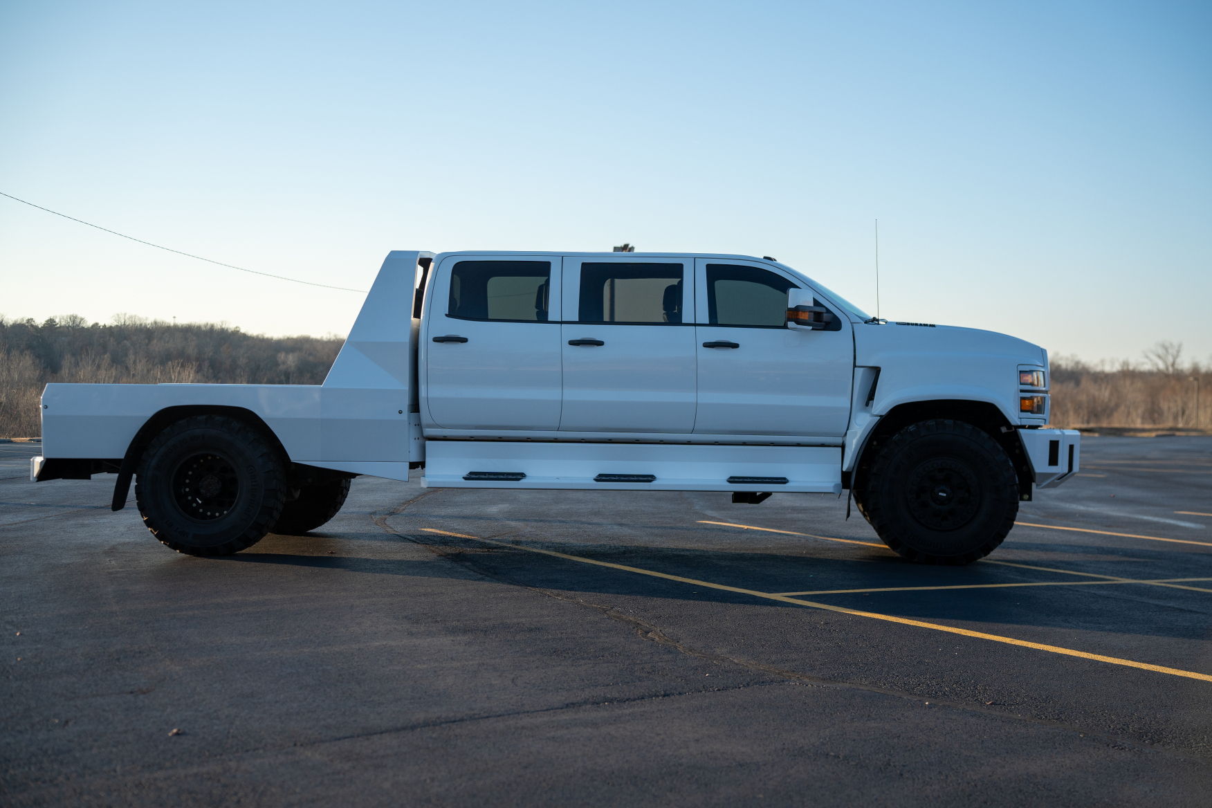 The black-finished 20″ alloy wheels are mounted with 365/80 Continental MPT81 tires, and a full-size spare is mounted in the cargo area. The trucks rides on an adjustable Kelderman air suspension system and is further equipped with a Kelderman steering stabilizer, Warn manually-locking front hubs, and four-wheel disc brakes with ventilated rotors. Corrosion is visible on the rear wheel hub.