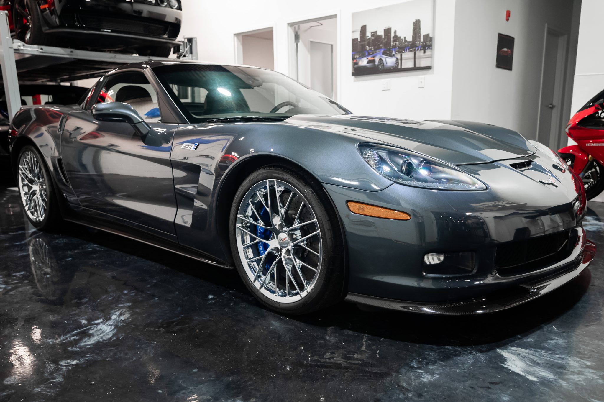 Chrome-finished 19″ and 20″ alloy wheels are mounted with older Michelin Pilot Sports tires. The car is equipped with Magnetic Ride Control, and braking is handled by gloss blue Corvette-branded Brembo calipers over a cross-drilled ceramic-composite disc at each corner.