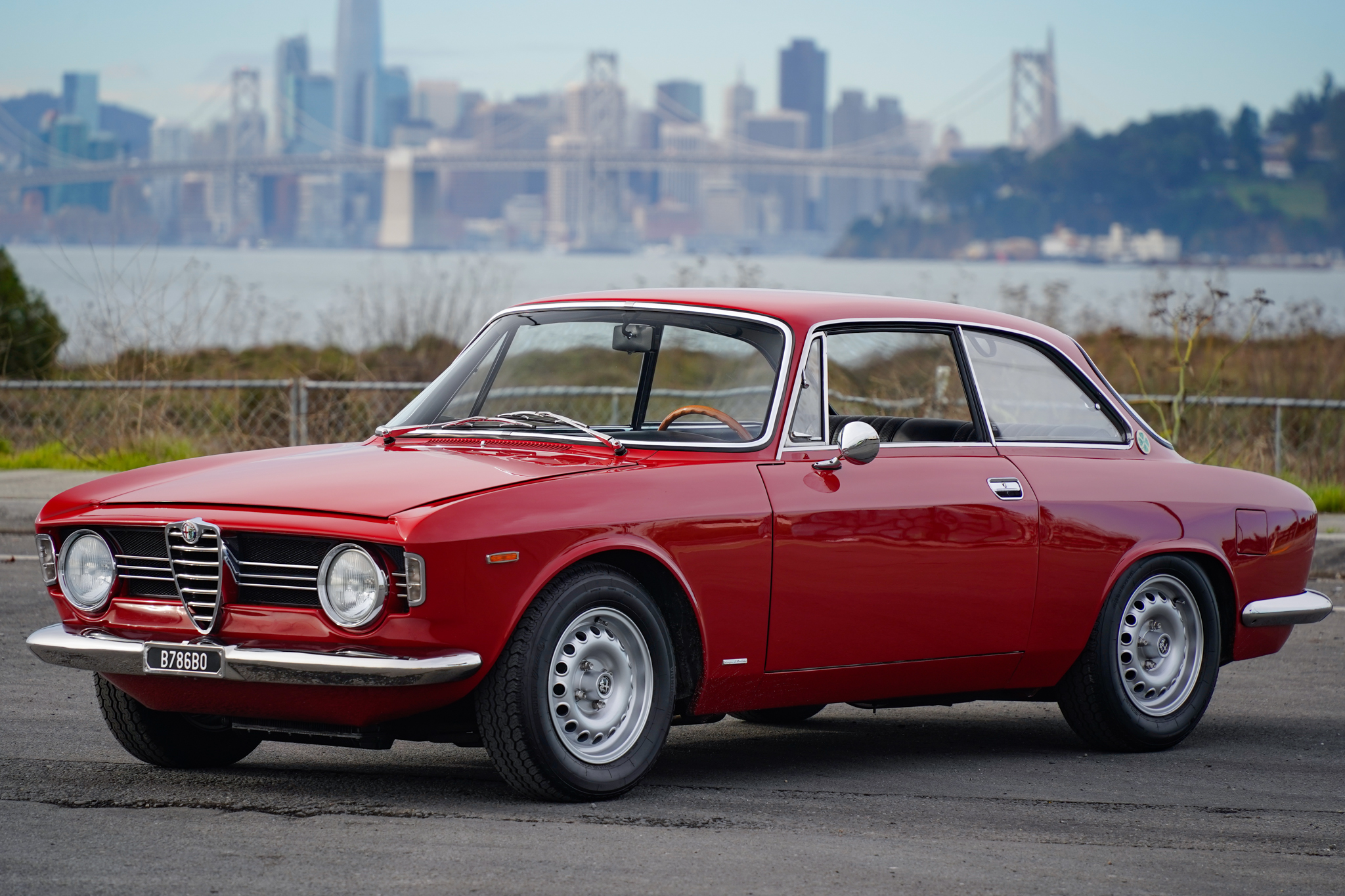 Reproduction GTA-style 14” alloy wheels are finished in silver and were mounted with 185/70 Vredestein Sprint Classic tires in 2023. Work performed at Alfa Performance Connection of Orange, California in August 2023 included installing an Alfaholics suspension kit and Wilwood front brake calipers as well as replacing the brake rotors, pads, front sway bar, spindles, hubs, and springs.