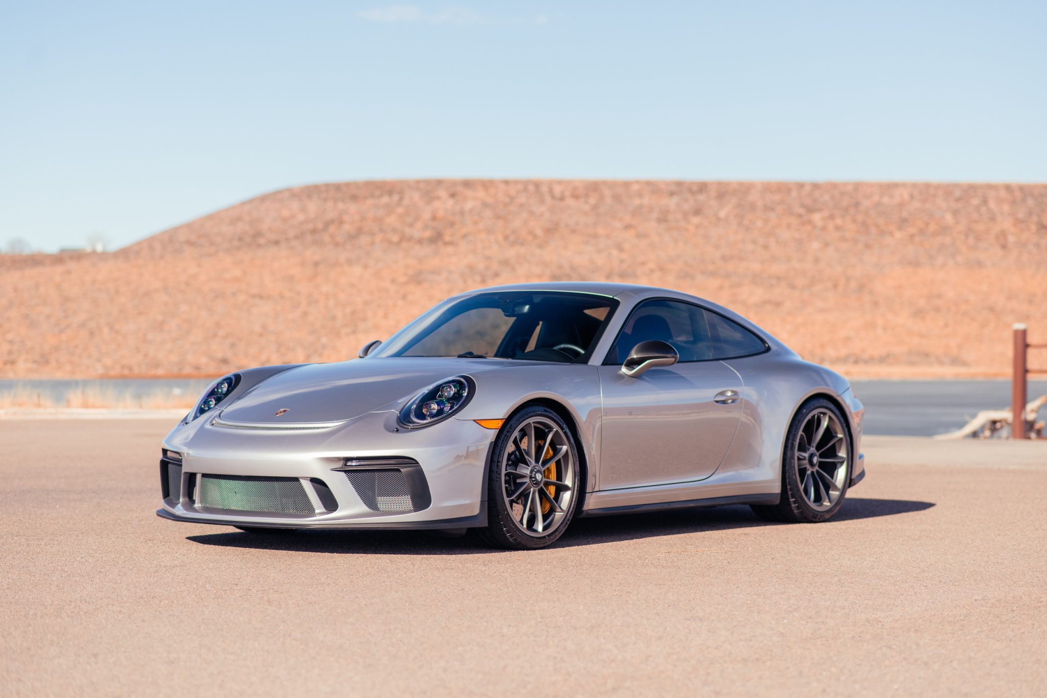 Satin Platinum-finished 20″ center-lock alloy wheels are mounted with Michelin Pilot Sport Cup 2 tires. Braking is handled by yellow Porsche-branded calipers over ceramic-composite rotors, and the car is equipped with a front-axle lift system. The brake fluid was flushed in December 2023.